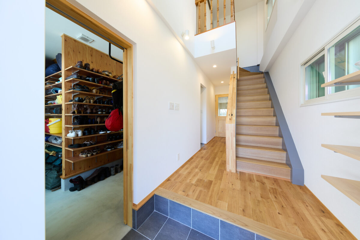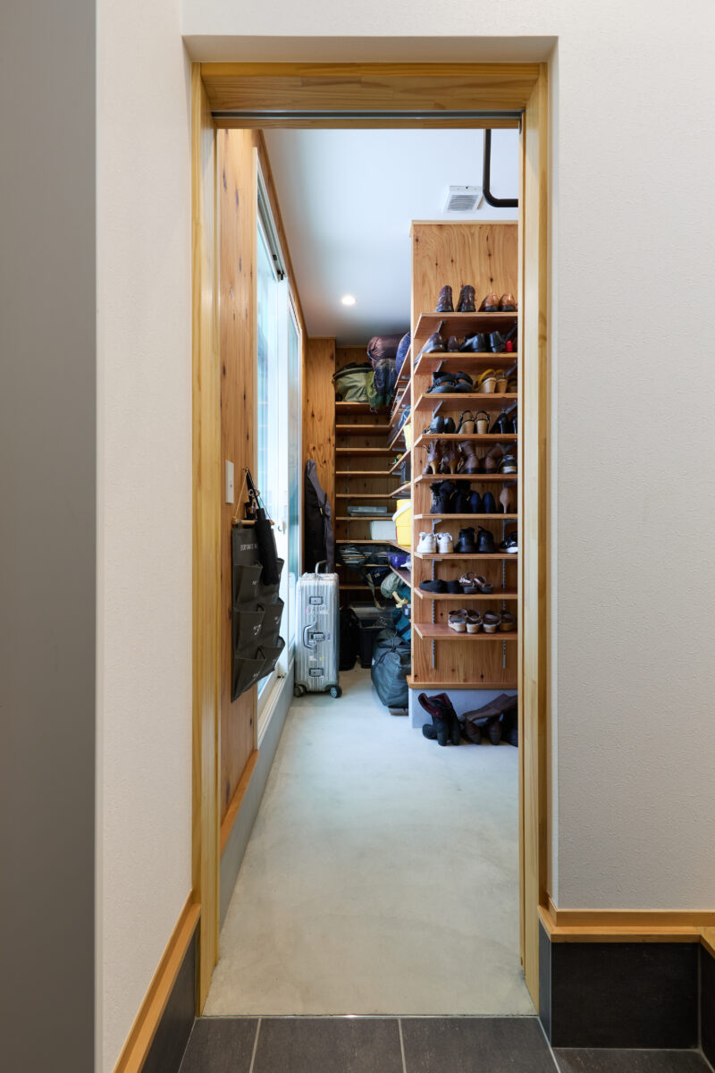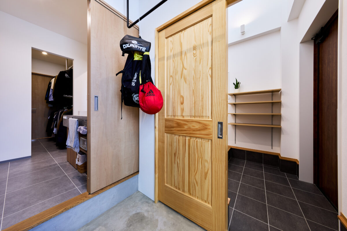 回遊動線にこだわった間取り計画は、ずぶ濡れになった日も、荷物がたくさんある日も、どんな日も対応できるプランになっていると思います。