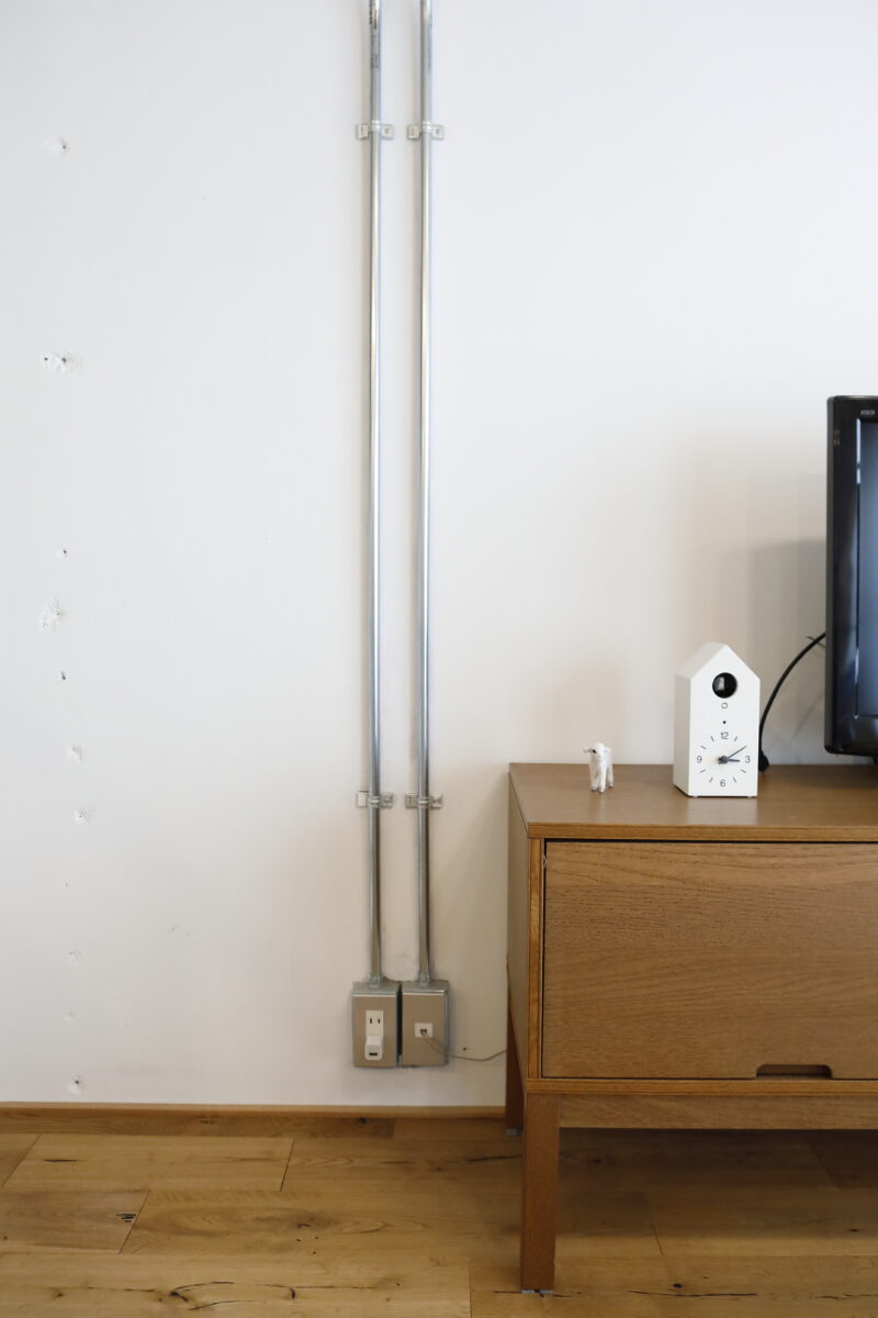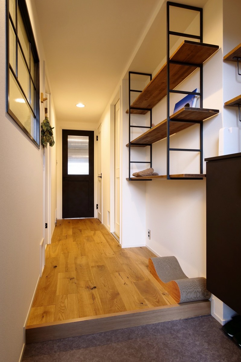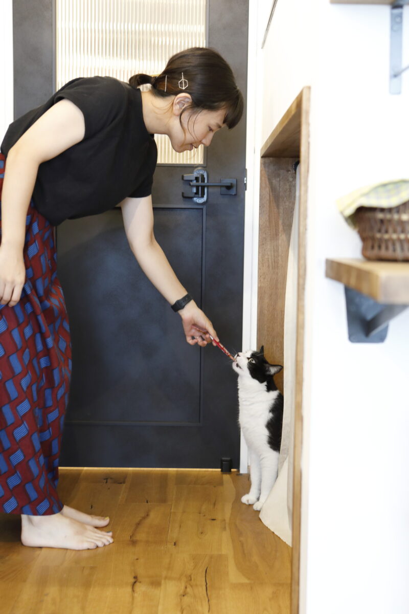 奥様と2人で打ち合わせをさせていただくことが多く、休日はお家で過ごされることが多いとのことでしたのでくつろいだり趣味が楽しめるスペースを気分によって使い分けていただけるようなプランをご提案させていただきました。木・鉄・モルタルの3つの素材を基調にほかの素材選びもさせていただきました。LDKの壁や棚の板をDIYで一緒に仕上げさせてもらったことはとても楽しく、私にとっても思い出に残るお家づくりとなりました。完成後のお家にお邪魔させていただいた時ネコちゃ