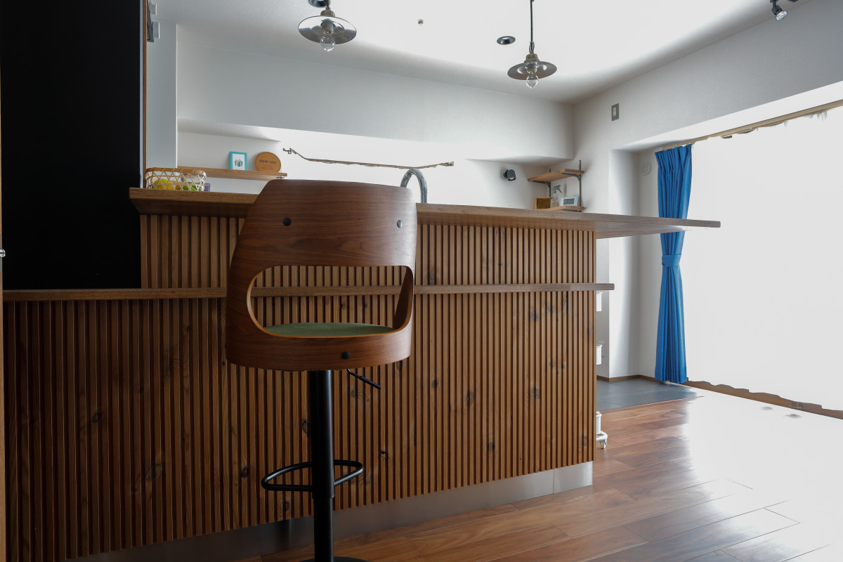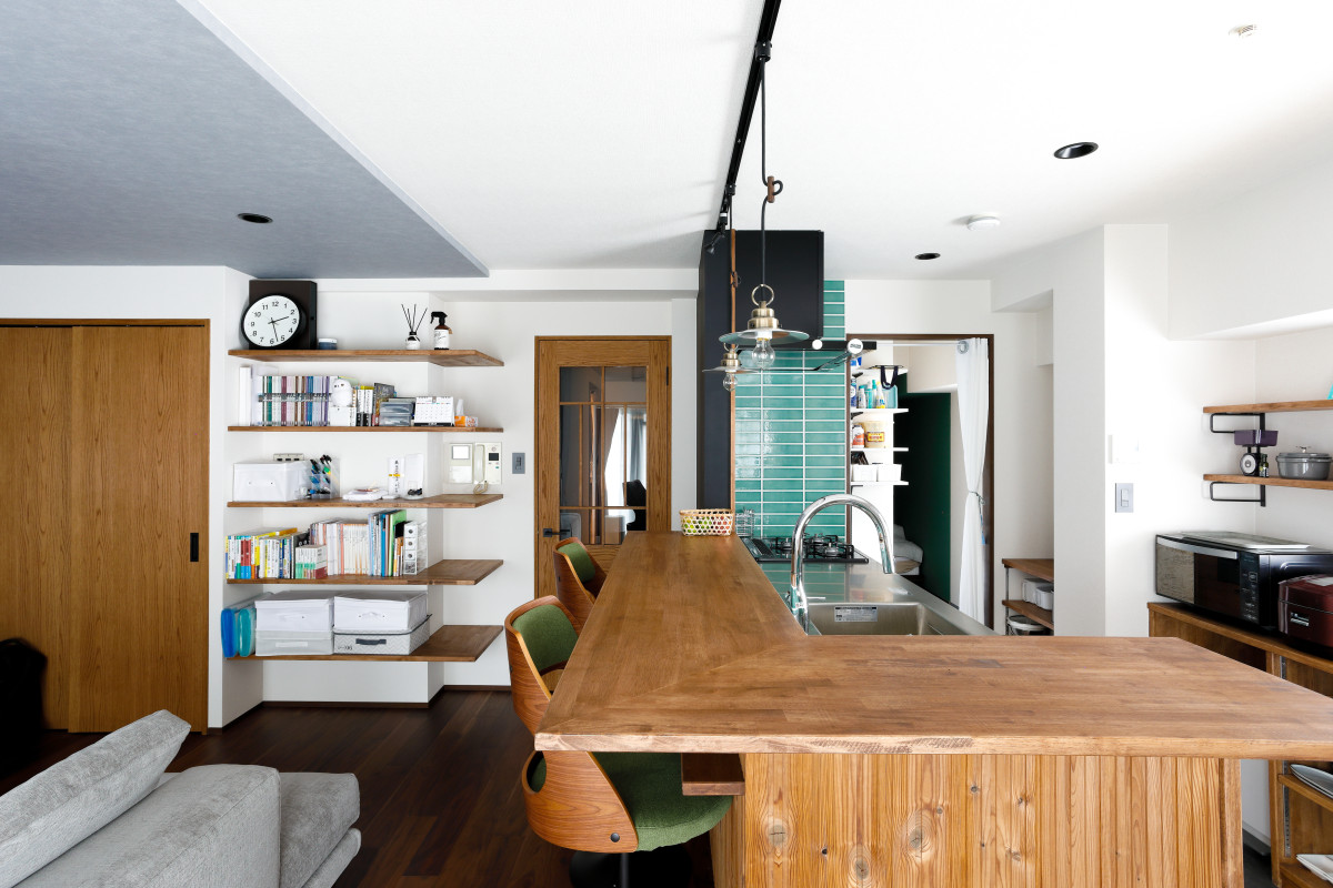 LDKをメインで、壁や天井のクロスに落ち着いたトーンのカラーを選定しました。それだけだと重たくなりがちな空間に、鮮やかなブルータイルや、ガラスの木製建具、素材感のあるパイン材の化粧板等を採用。その結果、程よい抜けと立体感ができ、バランスのとれた落ち着きのある空間になっています。