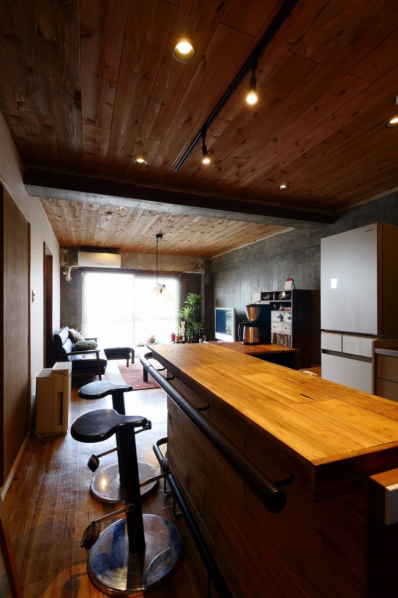 デザインする中で、綺麗すぎる空間をお好みではなかったため、既存のものの良さを最大限生かせるプランをご提案をさせていただきました。お任せしていただける部分が多かったため、お持ちだった 家具に合わせて木とモルタルを組み合わせかっこいい雰囲気にまとめました。