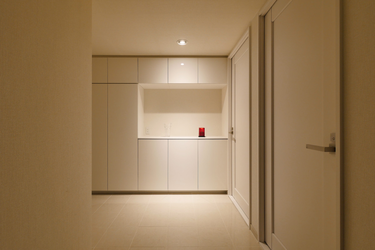 玄関には床の白い大理石をはじめ、全てを白で統一し高級感のある明るい空間となっています。