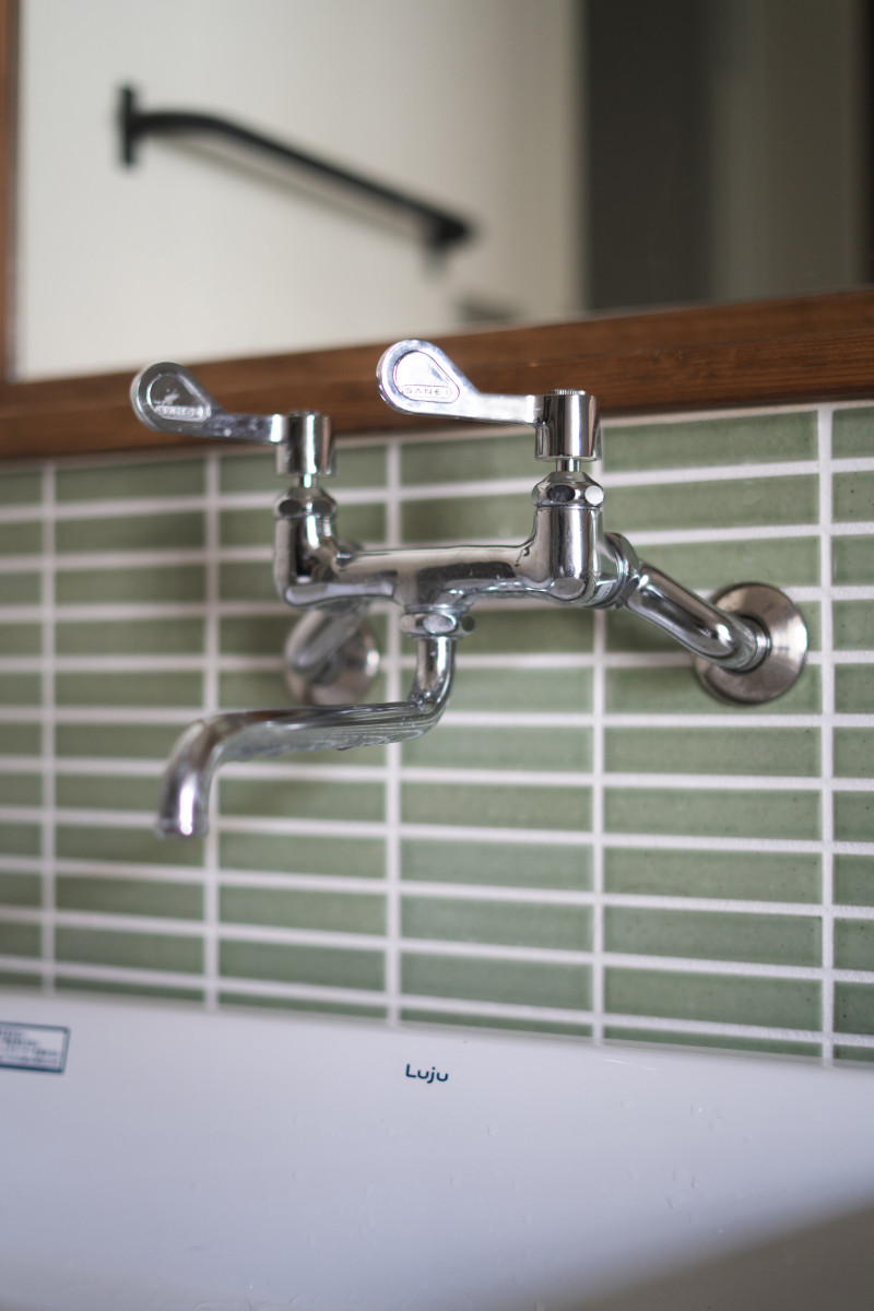 LDKに入るとまず目に入るキッチン。その正面には大胆にブルーのサブウェイタイルを貼りました。ブルーといってもこのタイルはペットロールブルーという落ち着いた色味で、癒しを感じられると共に、ウォルナットのカウンター天板や突き板フローリングともよく馴染んでいます。
