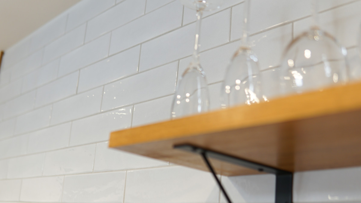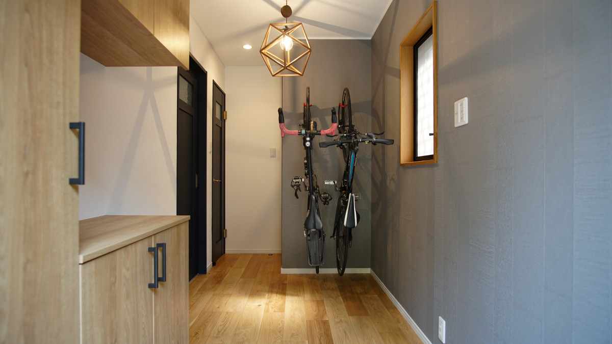 玄関はグレーの壁紙で部分的にアクセントをつけメリハリを出し、入って正面にはご夫婦の趣味である自転車を掛けられるスペースを設け、趣味を見せる収納となっています。