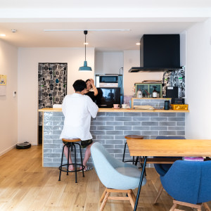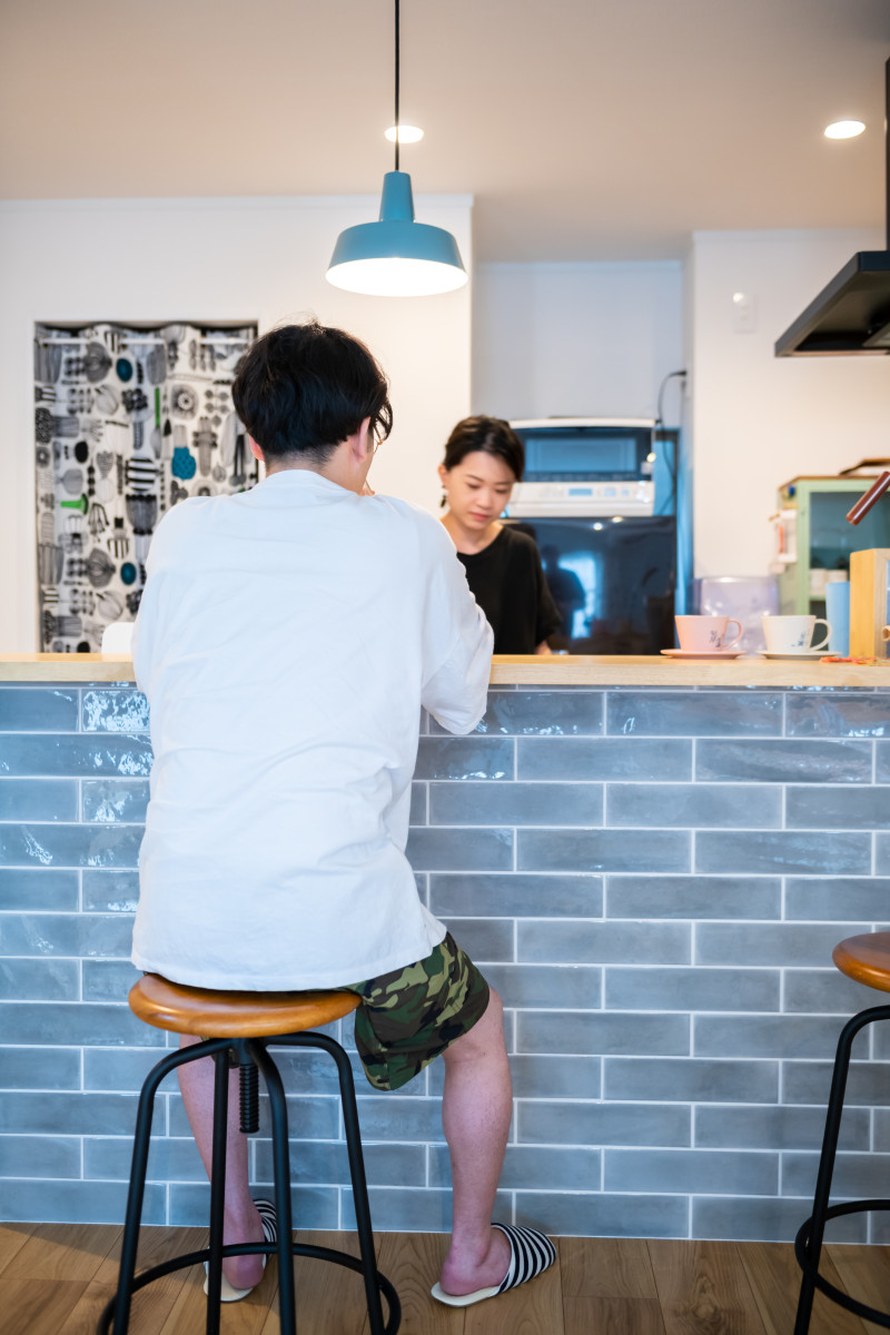 キッチンカウンターにタイルを使用したり、一部アクセントでブルーのクロスを貼ったりする事で