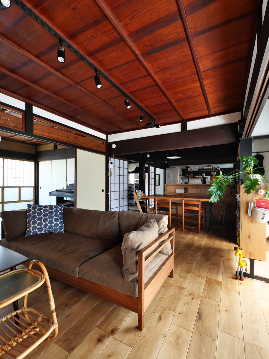 昔の趣をのこした欄間や竿ぶち天井は、クリア塗装を施すことによって経年変化の風合いを活かす仕上げにしました。