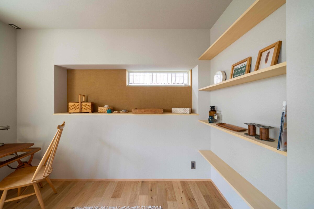 ニッチの壁にアクセントで使ったのはtoolboxのジュートクロス。素材感のある物がポイントで入るだけで遊び心とデザイン性も演出できます。