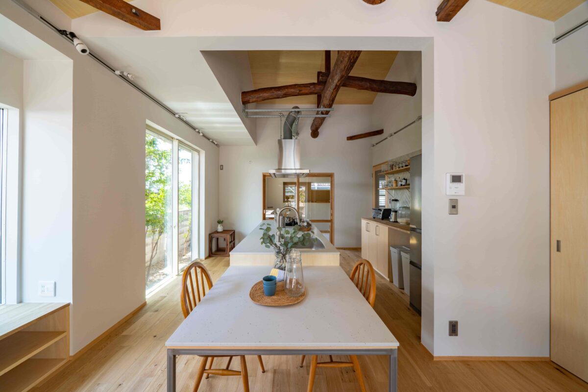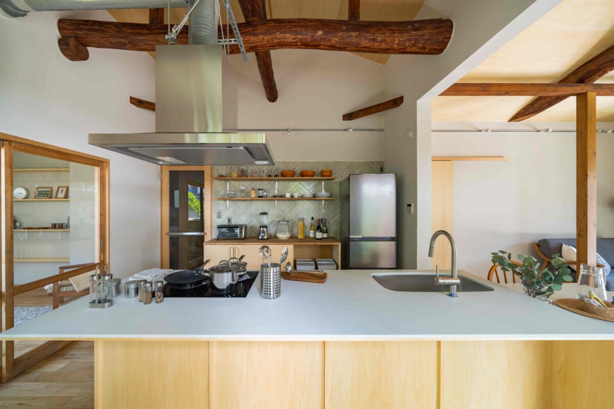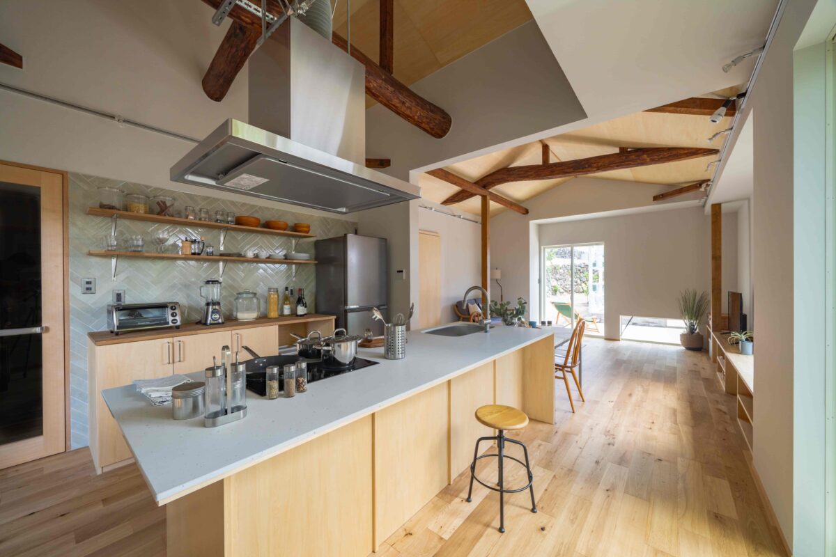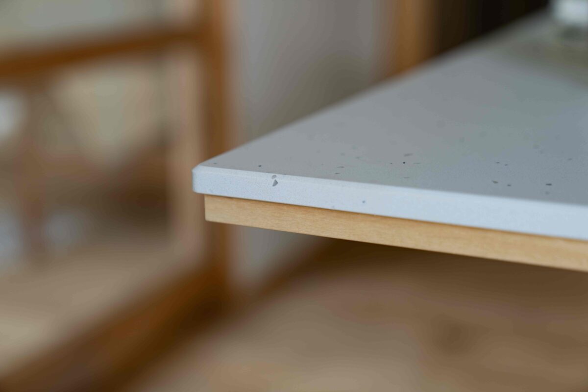 この家の主役とも言えるアイランドキッチン・テーブルの天板には揃いのクオーツを採⽤。 天然⽯ならではの魅⼒は美しさに加え、優れた耐久性や汚れに強い機能性も兼ね備えています。