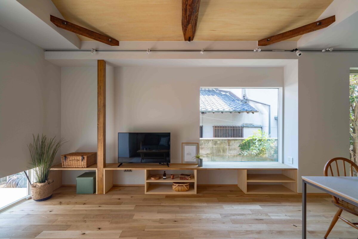TVボードとしても使える造作したベンチ。コンパクトなスペースだからこそ、多様性を。