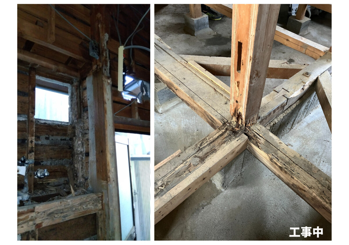 解体時に見つかった水回りの腐食部分や柱は、原因を突き止めて補修。また構造計算を⾏い、断熱材と耐震補強を適切に⾏うことで、耐震等級1と断熱等級4を達成。