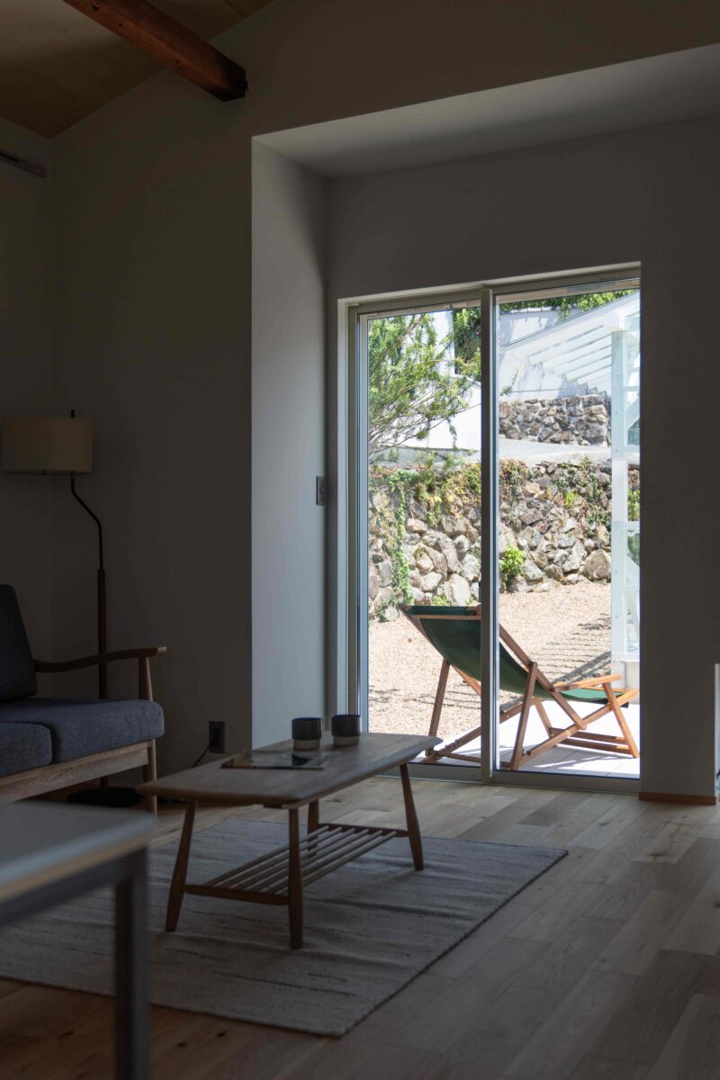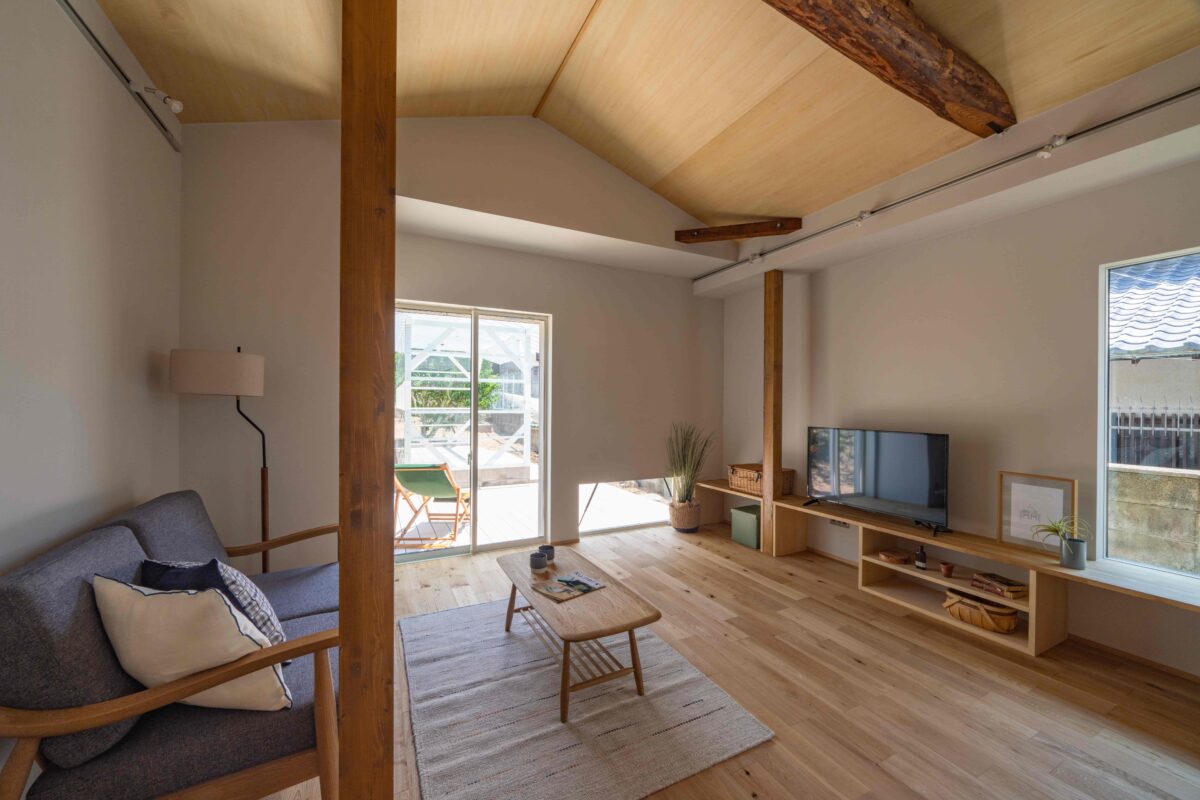 ⼀⾒少し物⾜りなさそうに感じますが、⽊造構造をうまく活⽤し、 敢えて間仕切りの無い⼤きなワンルームにすることで、⼀体感のある広さをつくりあげています。また新たに作った開⼝部は、採光だけでなく、空間に広がりをもたらせています。