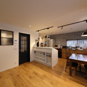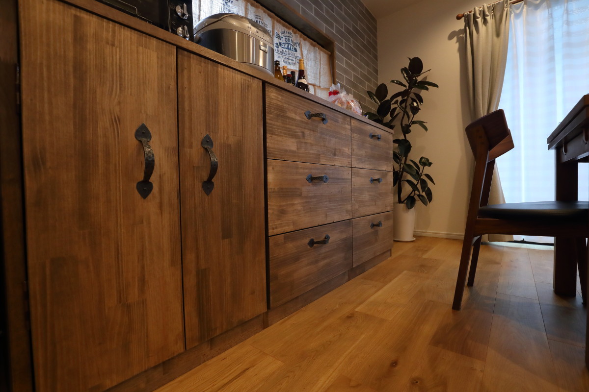 キッチンや玄関の収納は枠組みのみこちらで作成させて頂き、残りはご主人様がDIYで仕上げをされました。