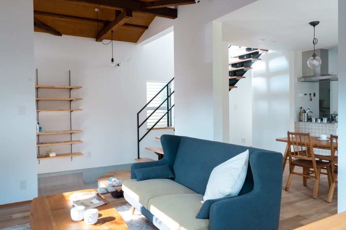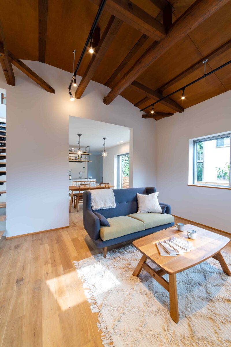 リビングの天井は解体で出てきた梁を活かし、躯体現しに。