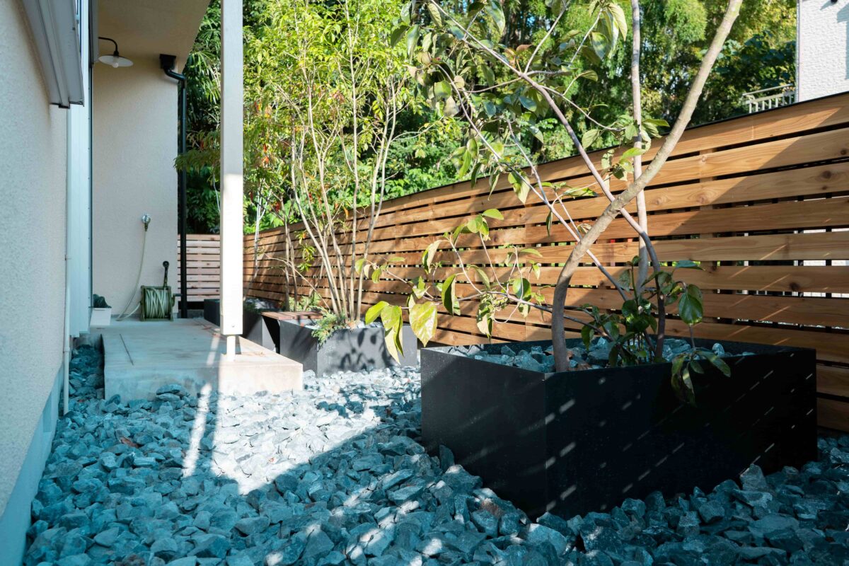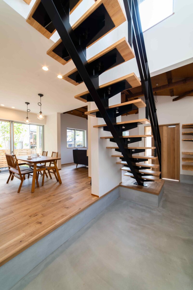 玄関から繋がる縦長の土間は、階段下を有効活用し、外遊びで使うアウトドアアイテムやロードバイクを収納することができます。 1本軸の鉄骨階段は、2階につづく吹き抜けと相まって解放感バツグン。