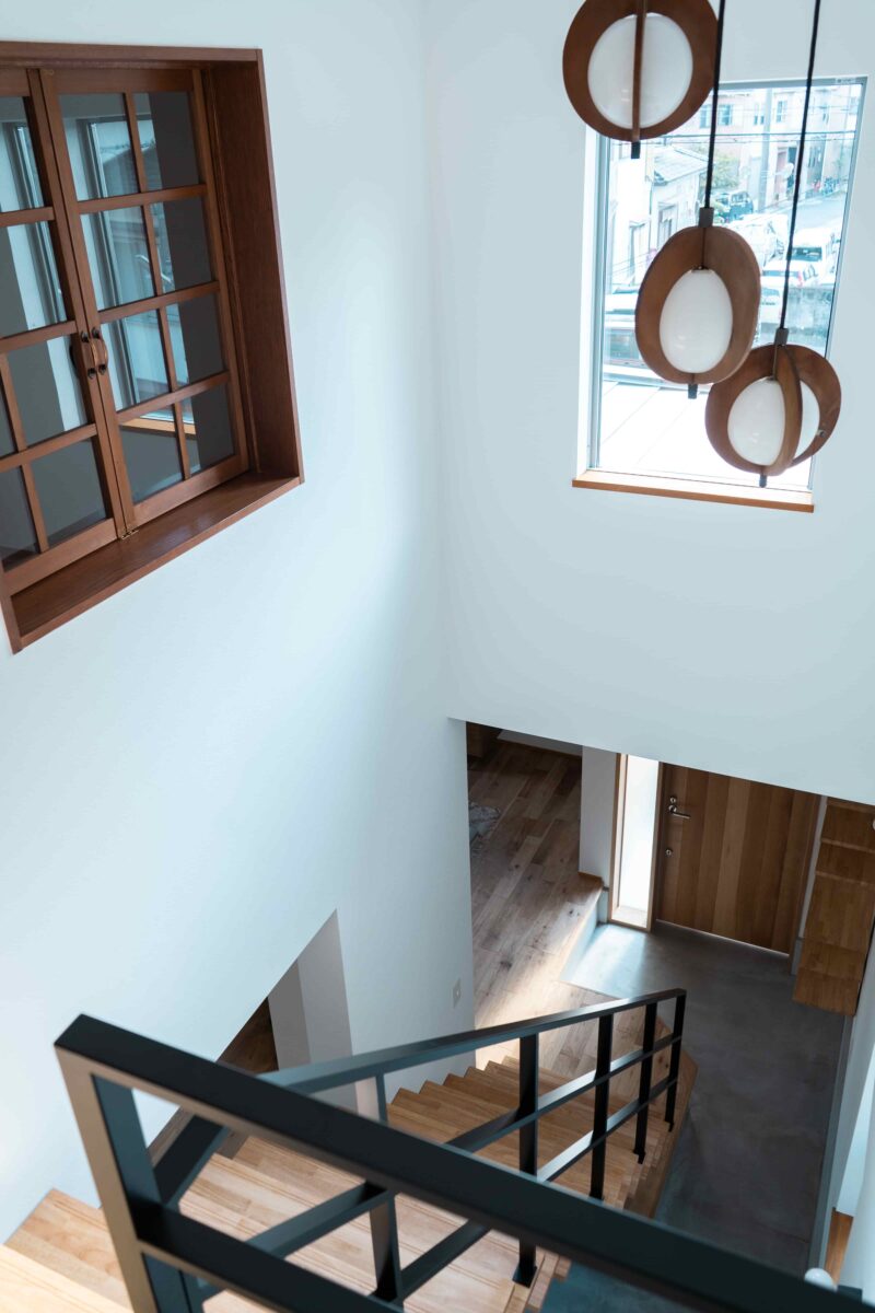 吹き抜けの天井には、もともと付いていた北欧テイストの照明を使用し、2階の室内窓もそのままにしています。リノベーションならではの新旧の組み合わせが美しい!
