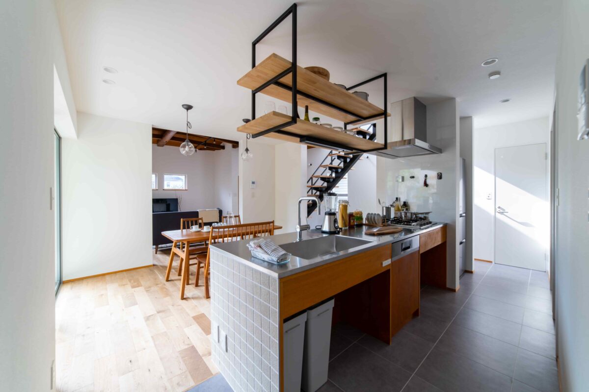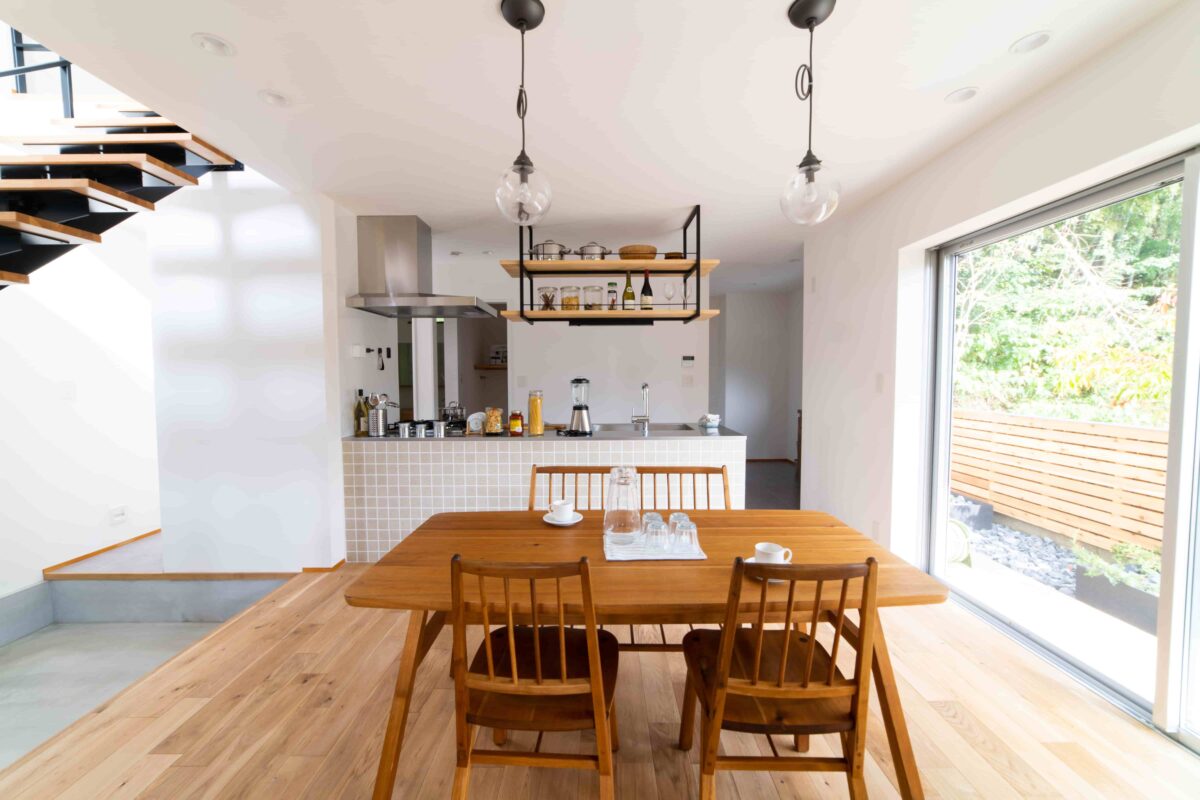 北欧系のナチュラル家具が映えるように、全体的に明るいトーンで合わせたキッチン・ダイニング。掃き出し窓から入る心地よい光が家全体を包み込みます。