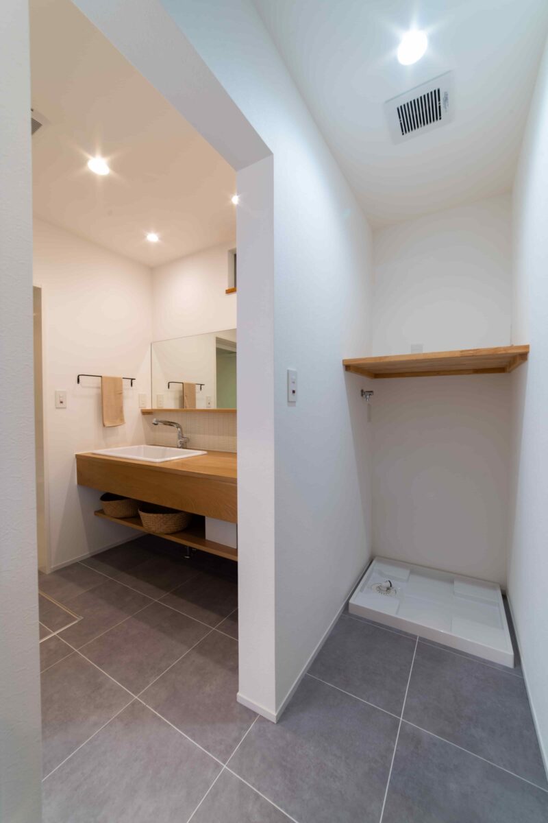洗濯機上にはガス乾燥機も設置できるように棚板を設置。脱いだものを洗い、乾燥させてそのままウォークインクローゼットに収納することができるため、日常の家事動線が最短となります。