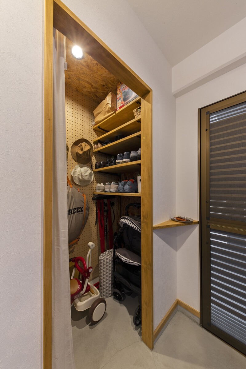 水槽の反対側はシューズインクローク。壁いっぱいまでの可動棚と有孔ボードでレイアウトを自由に組むことができます。