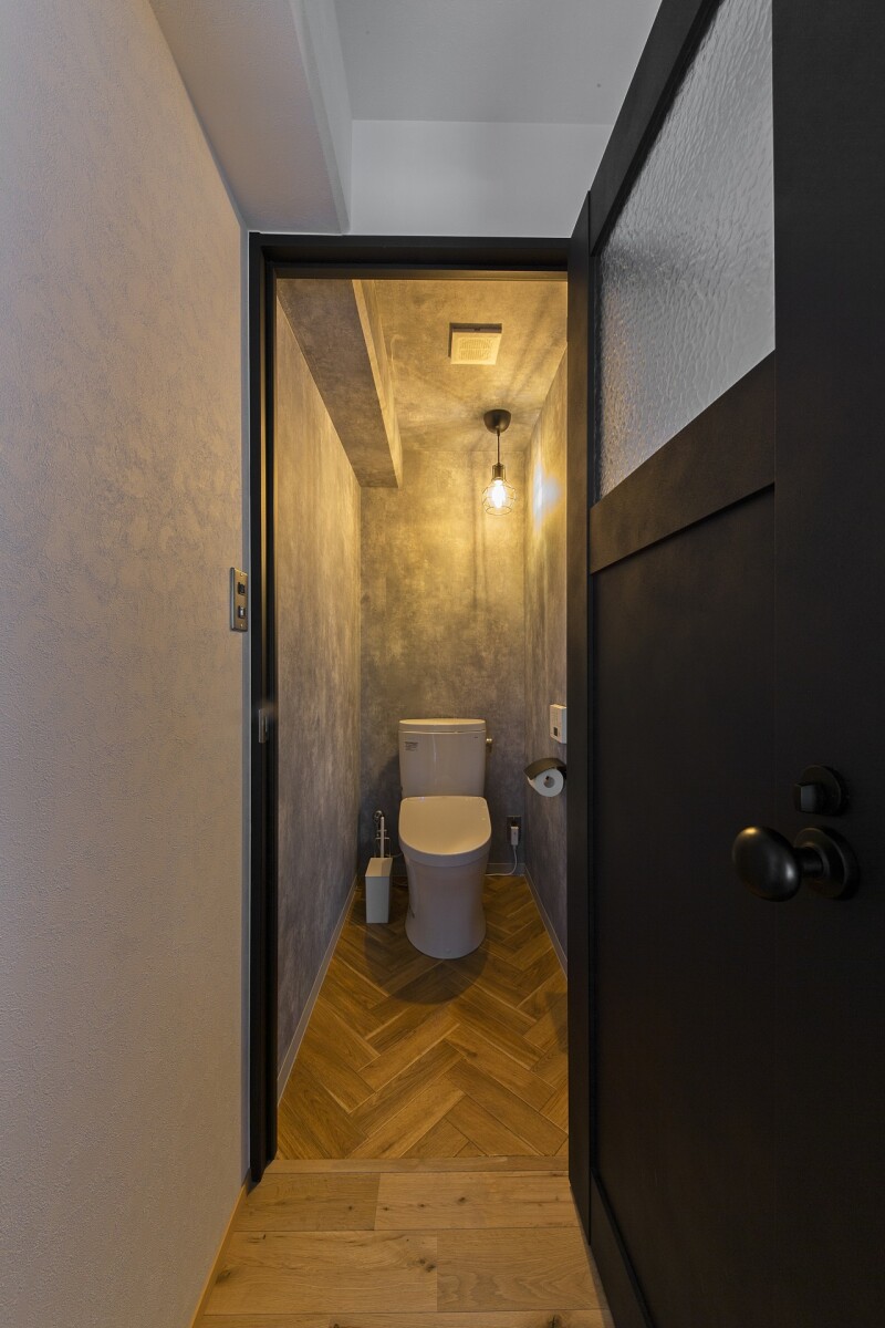 ご主人より「監獄テイストで」とお願いされたトイレ。建具を含めダークトーンで仕上げ、暗いけどなぜか落ち着くこもれるトイレになりました。