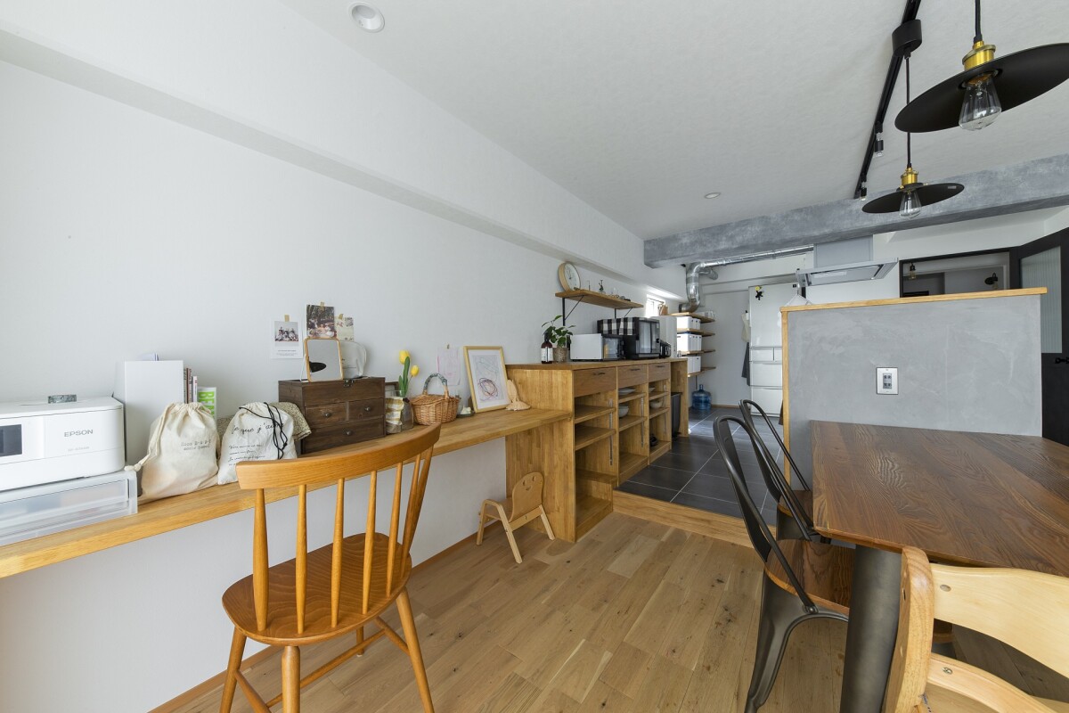 ダイニング背面には裁縫が趣味の奥様が作業するデスクを造作。天板に高強度のゴム集成材をした事で途中に脚がなく横移動の作業がしやすくなっています。