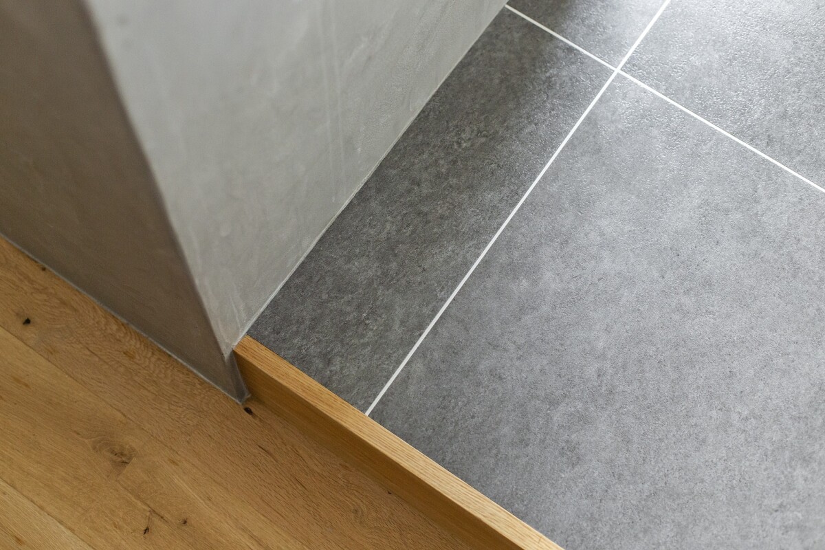 奥様が選び抜いたこだわりタイルが特徴の洗面所。リビングと繋がる内窓を設けているのでマンションにありがちな閉塞感を無くしています。