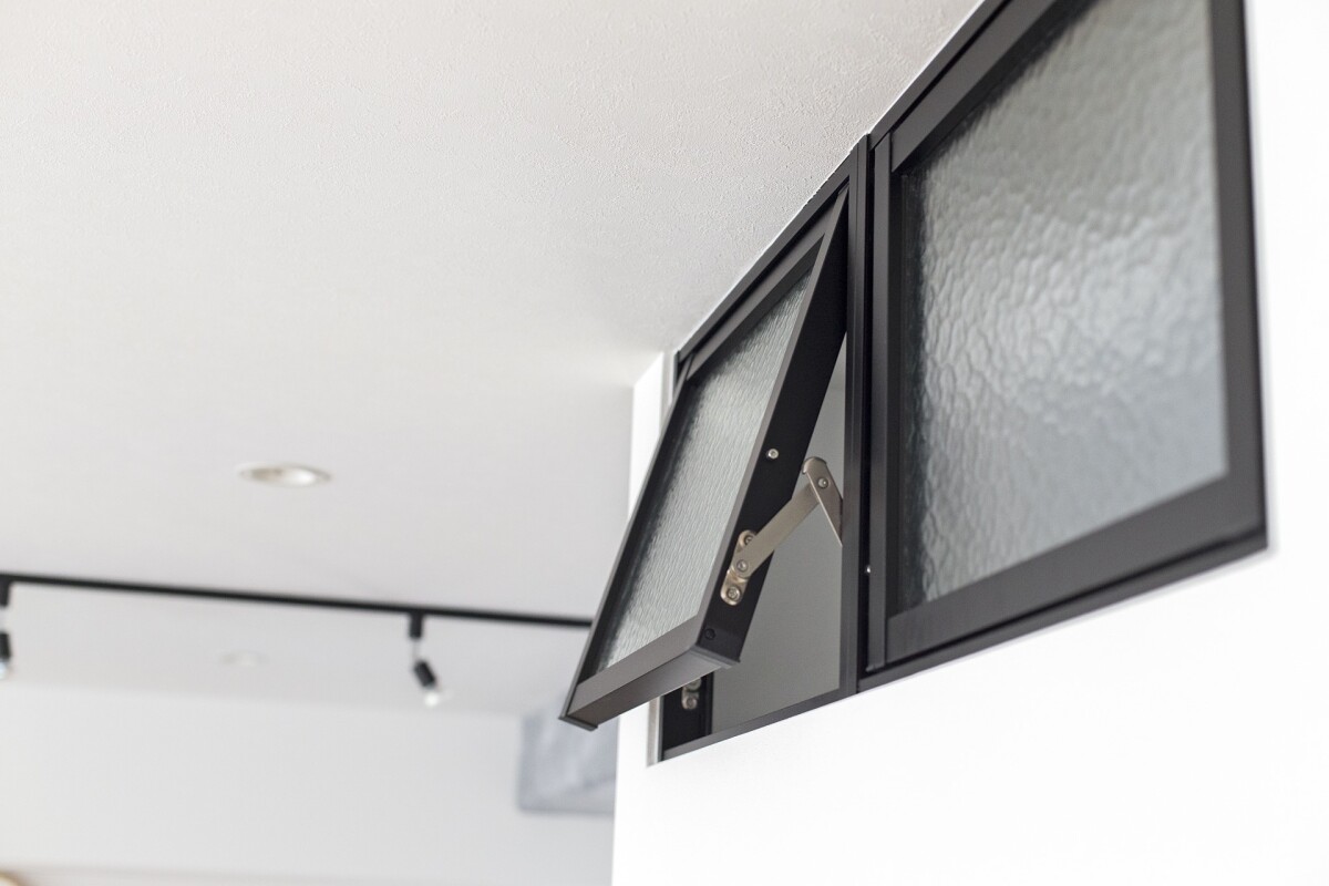 キッチン本体は幅255cmのシステムキッチン。空間のアクセントとして梁の一部にモルタル調のクロスを貼りました。