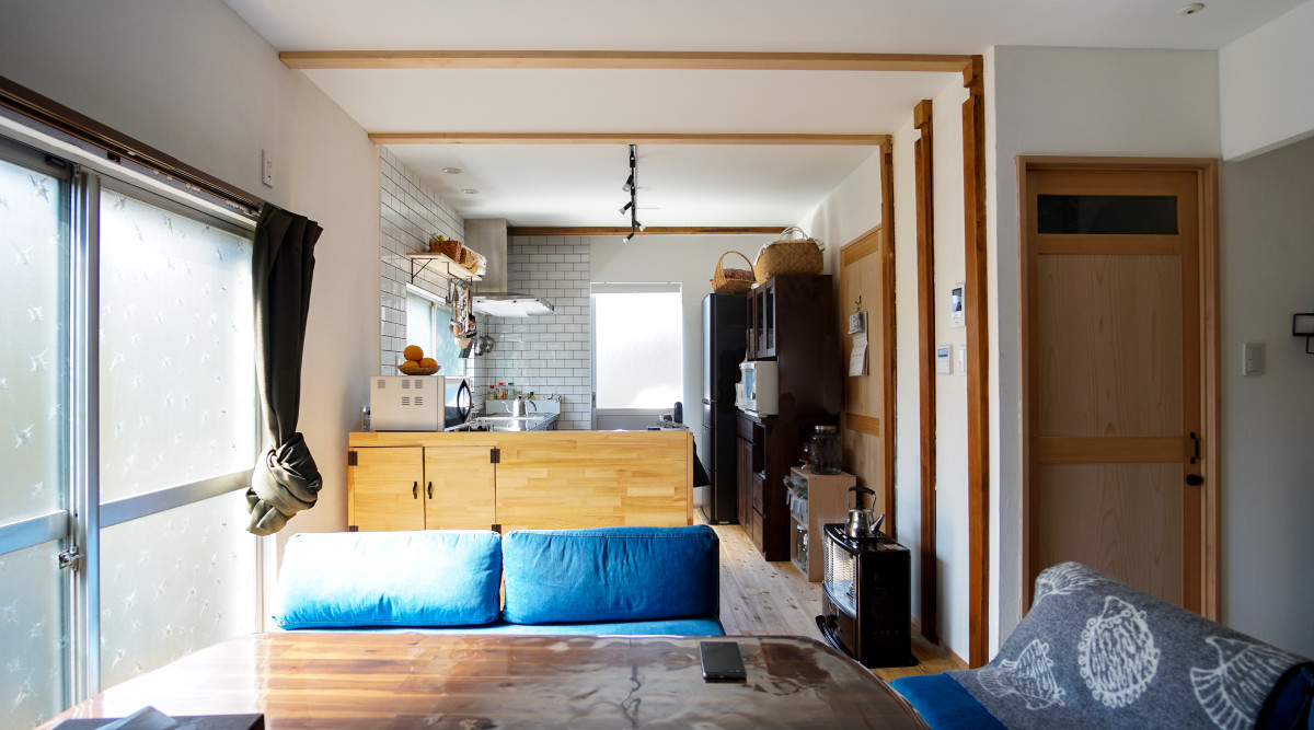 元々2部屋の和室とリビングダイニングで区切られ光の通らなかった空間は、間仕切り壁を撤去し、そのほかの壁を白で塗装した事で広く光の抜ける明るいLDKになりました。
