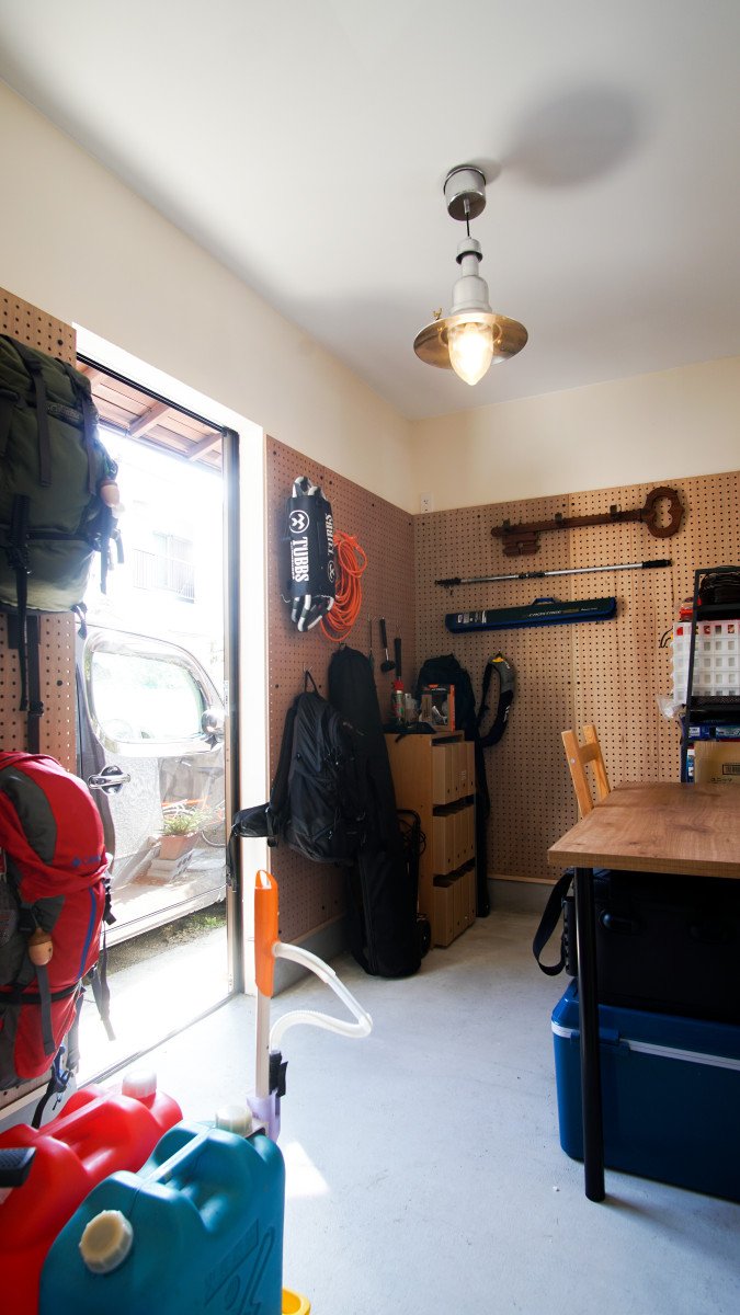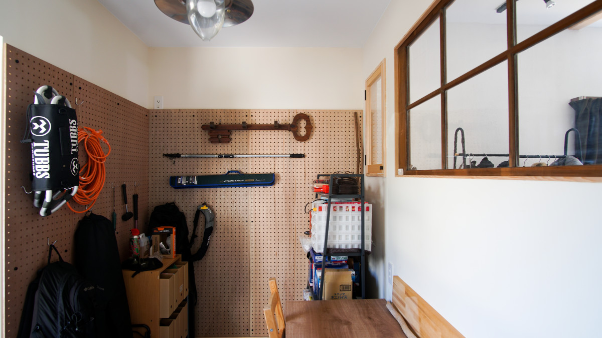 趣味部屋は玄関と駐車スペースの両方からアプローチできる使い勝手の部分と、壁面を有孔ボードにした事で飾るように収納できる