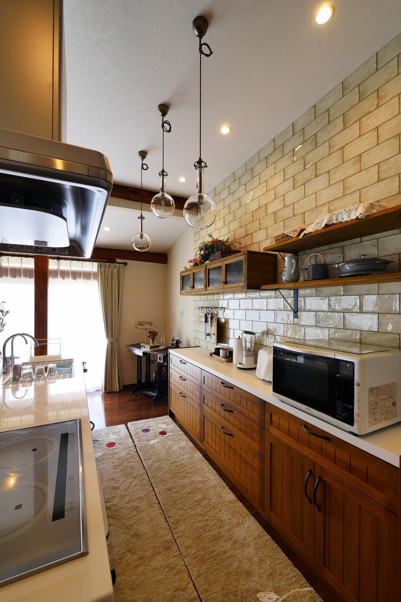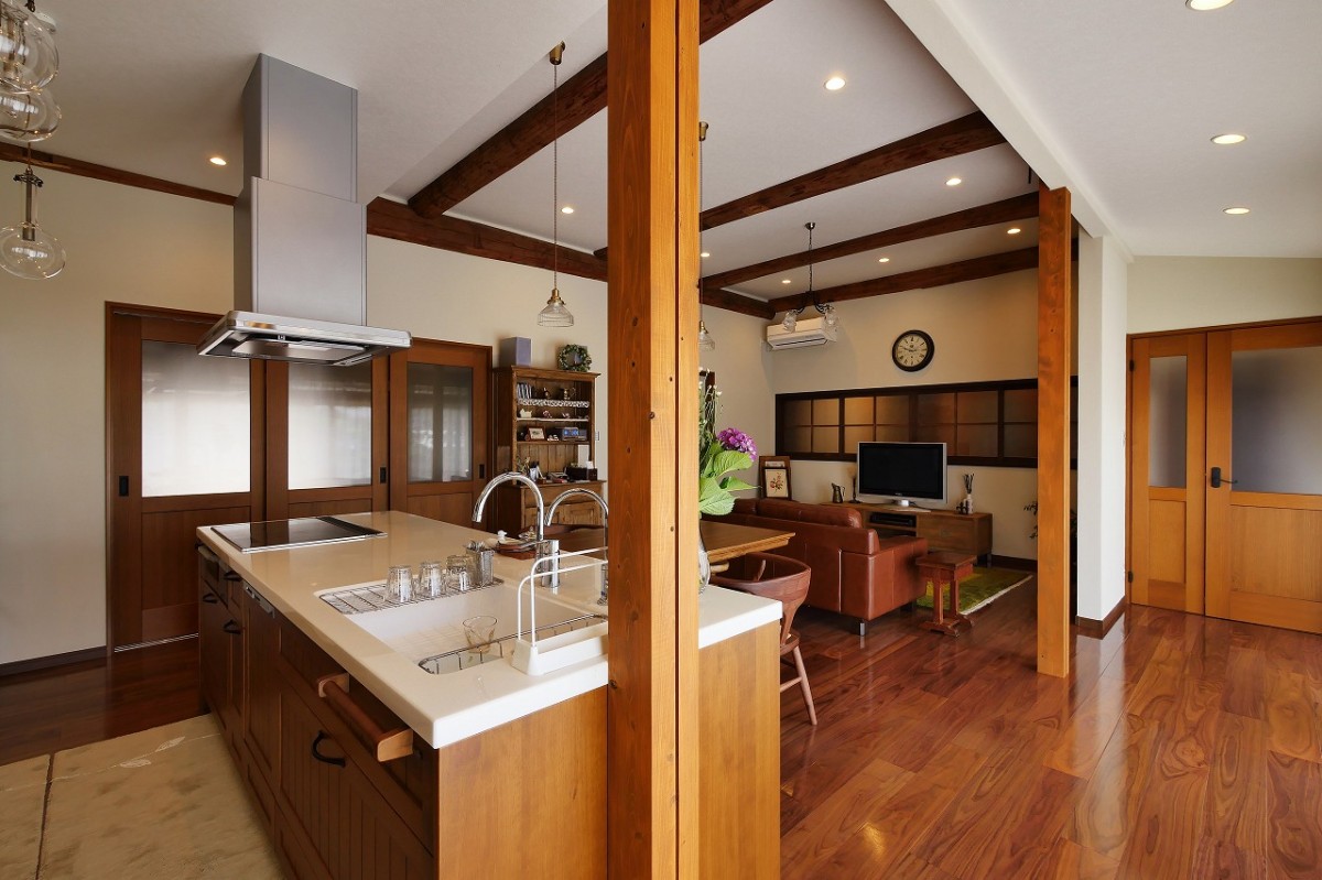 LDK全体を見渡すことのできる、アイランドキッチンは無垢材を使用し、温かみのある雰囲気に。