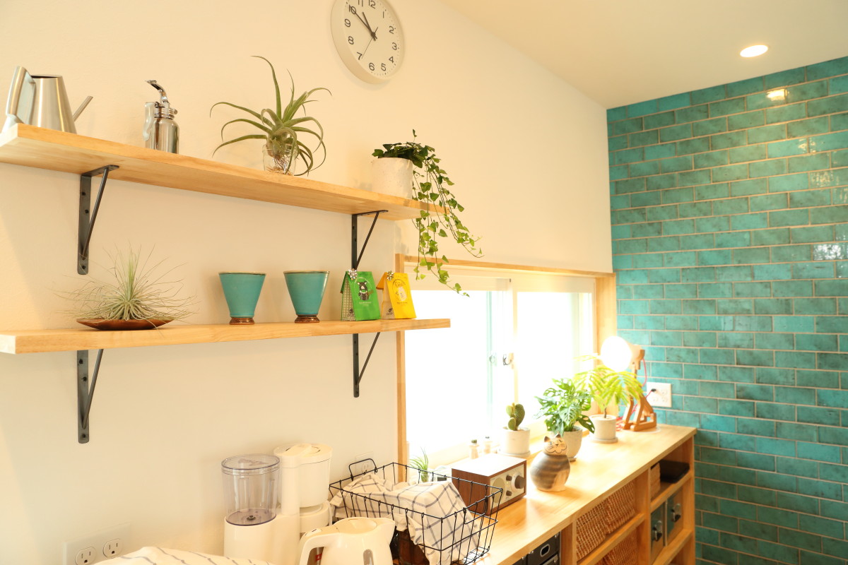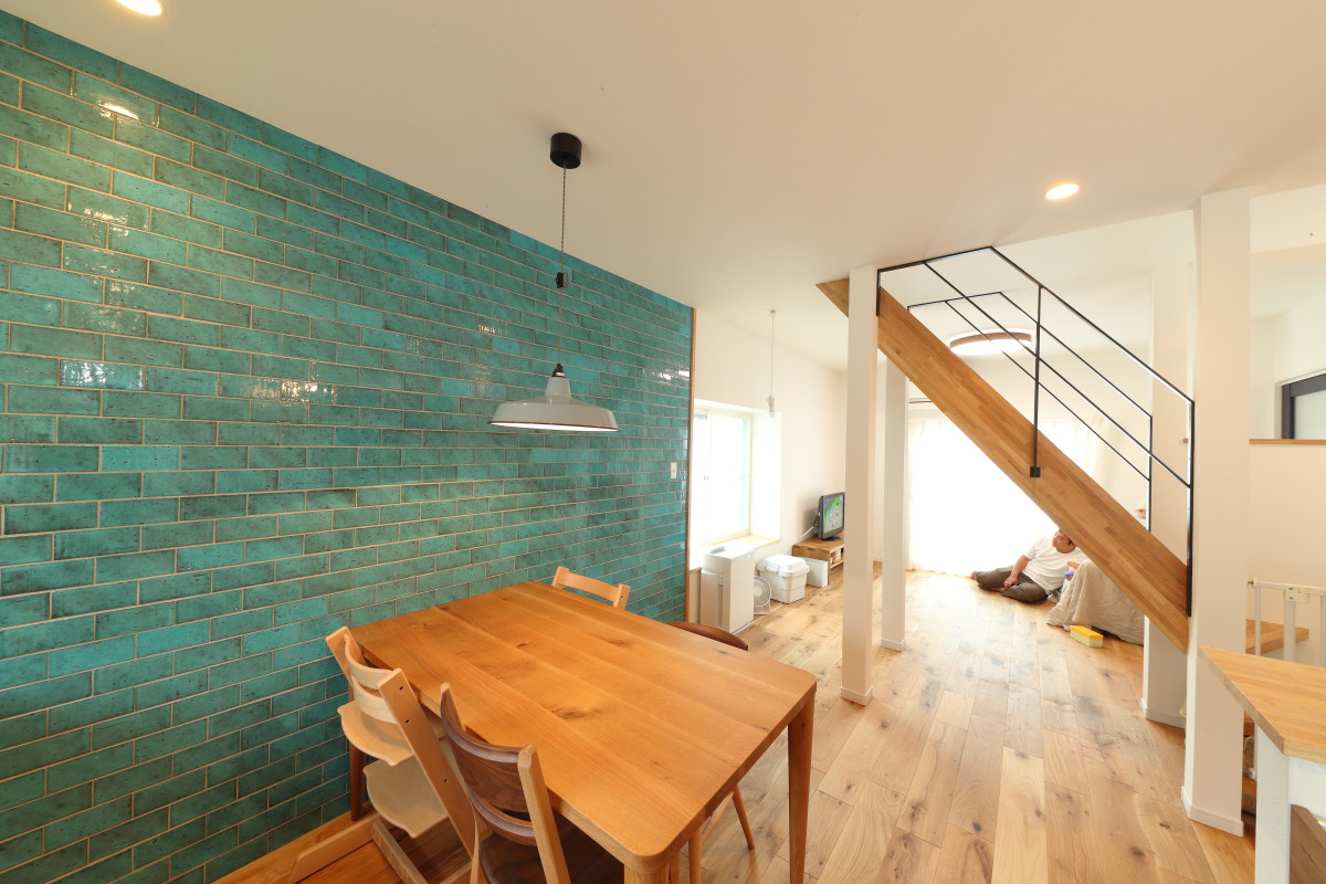 ダイニングエリアの青いタイルは強い印象を与え、空間の主役になりました。