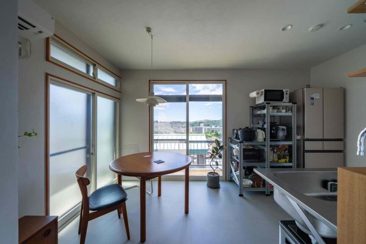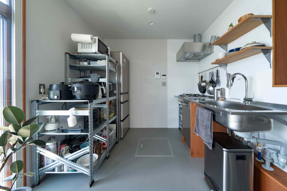 この家が持つ横長の空間をうまく使い、キッチン・ダイニングは1階に、リビングは2階に配置しました。