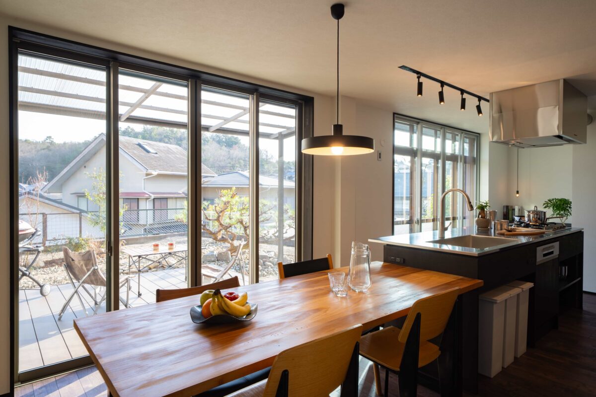 大きな窓の向こうに庭の景色が広がるダイニングキッチン。窓サッシの入れ替えや二重窓の新設により、快適さもしっかり高めています。
