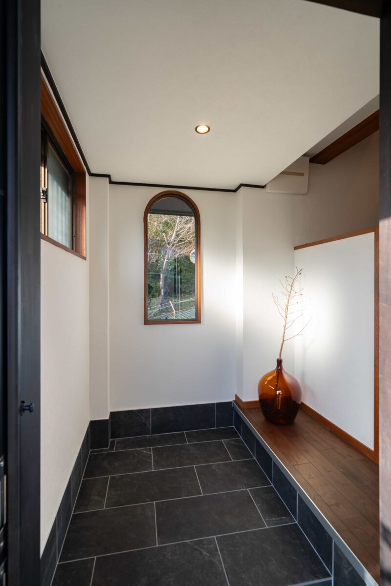 既存を活かしたアーチ窓が印象的な玄関。床には水や汚れに強いエヴォストーンを採用し、使いやすさとデザイン性を両立させました。