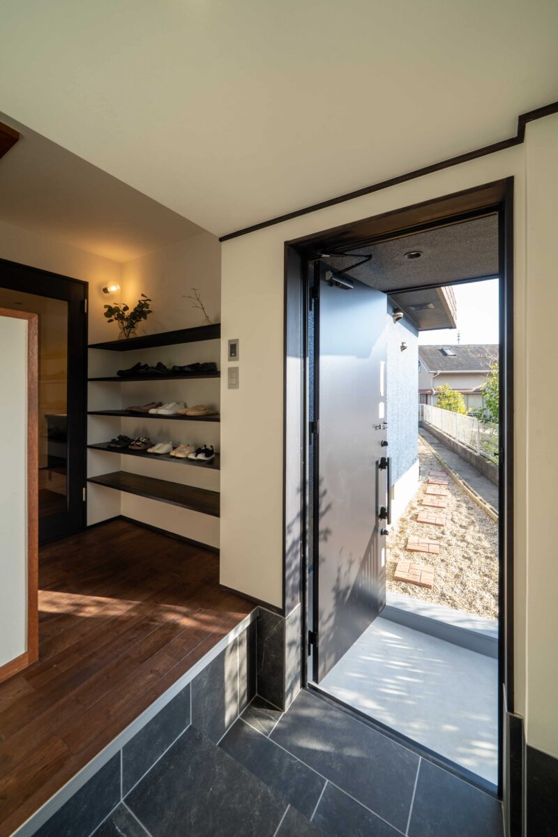 廊下側に靴棚を設け、玄関へ回らずに靴を出し入れできる動線に。使い勝手を考えた収納計画です。