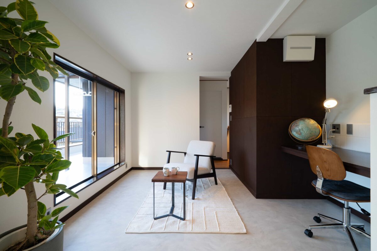 一部を意匠としてラワン張りにしたセカンドリビング。書斎も併設し、リモートワークや作業など、静かに集中したい時間を過ごせる空間です。