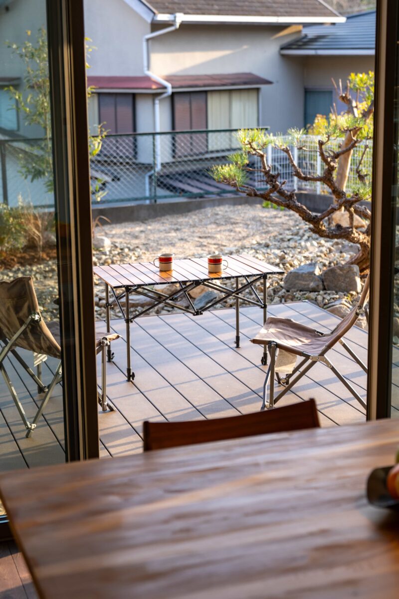 リビングとダイニングを外部でつなぐウッドデッキ。耐久性やメンテナンス性にも配慮した素材を採用しています。