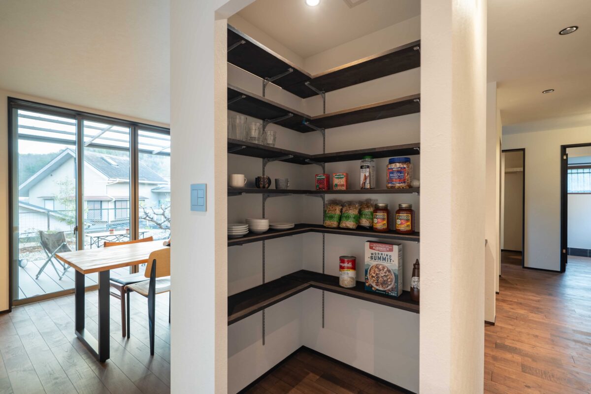 インナーガレージから室内に入るとすぐに現れるのは、大容量のパントリー。0秒動線で荷物をそのまま収納でき、ダイニングからは見えない配置のため、空間もすっきりと保てます。