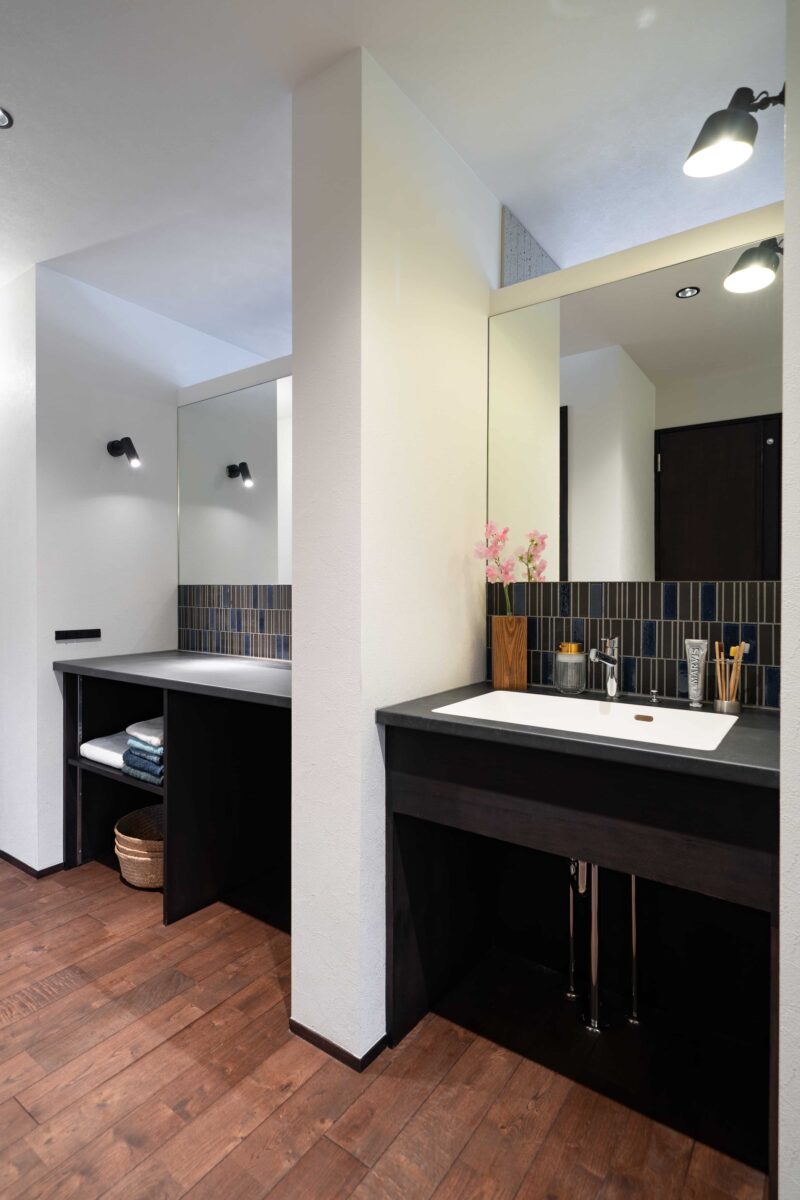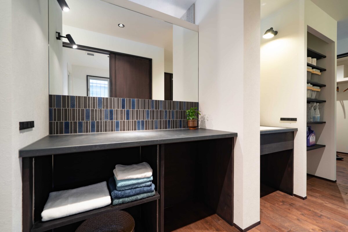 造作洗面台の隣には、洗濯物を畳んだり、アイロン掛けをしたり、メイクをしたりと、さまざまな用途に使えるマルチ作業台を設けました。