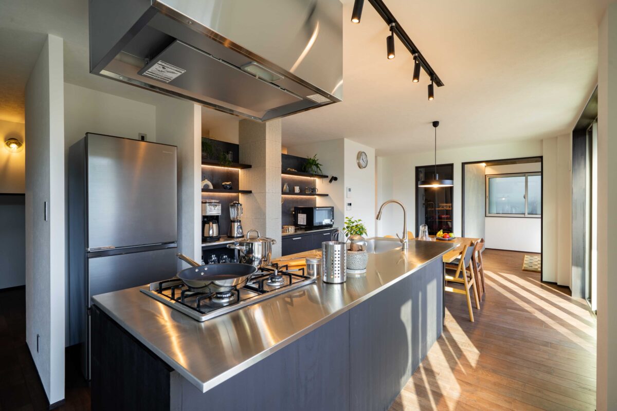 キッチンは、ラワンベニヤ×ステンレス天板で造作したもの。ダイニング越しに設けたFIX窓からは、インナーガレージを眺めることもできます。