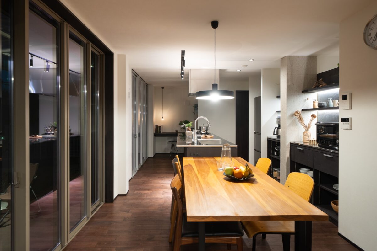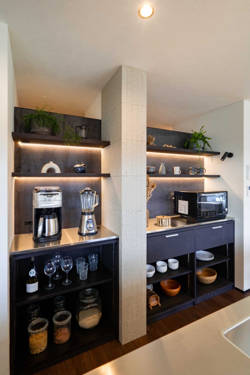 キッチン背面には造作のカップボードを設置。間接照明や引き出しを設けることで、見せたいものと隠したいものをバランスよく収納できるよう計画しました。