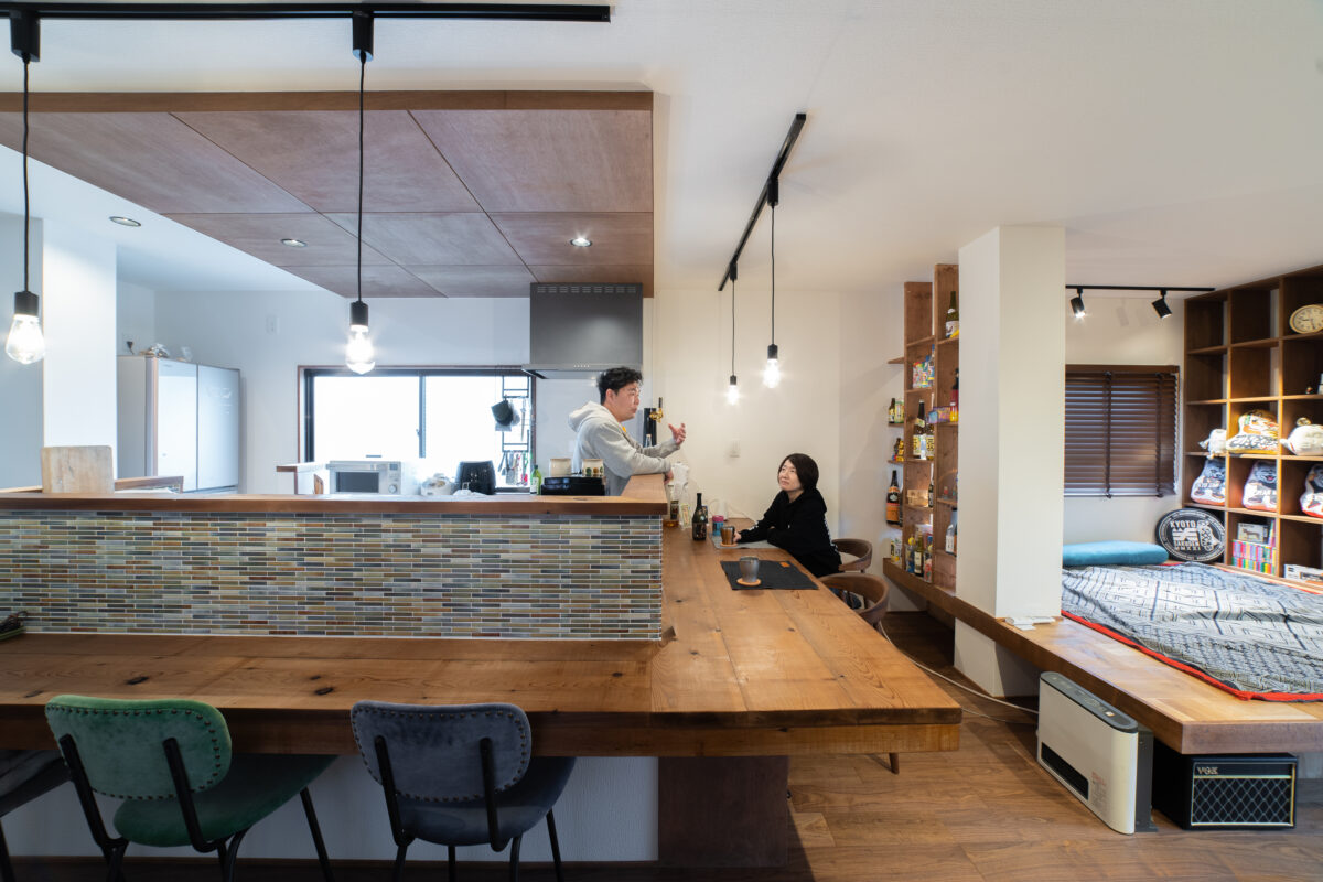 今回はそれを下がり天井のキッチンや幅広のL字カウンター、小上がりのくつろぎ空間を作り立体感を持たせた事で連続性が生まれ、1つのまとまった空間として成立させることができました。
