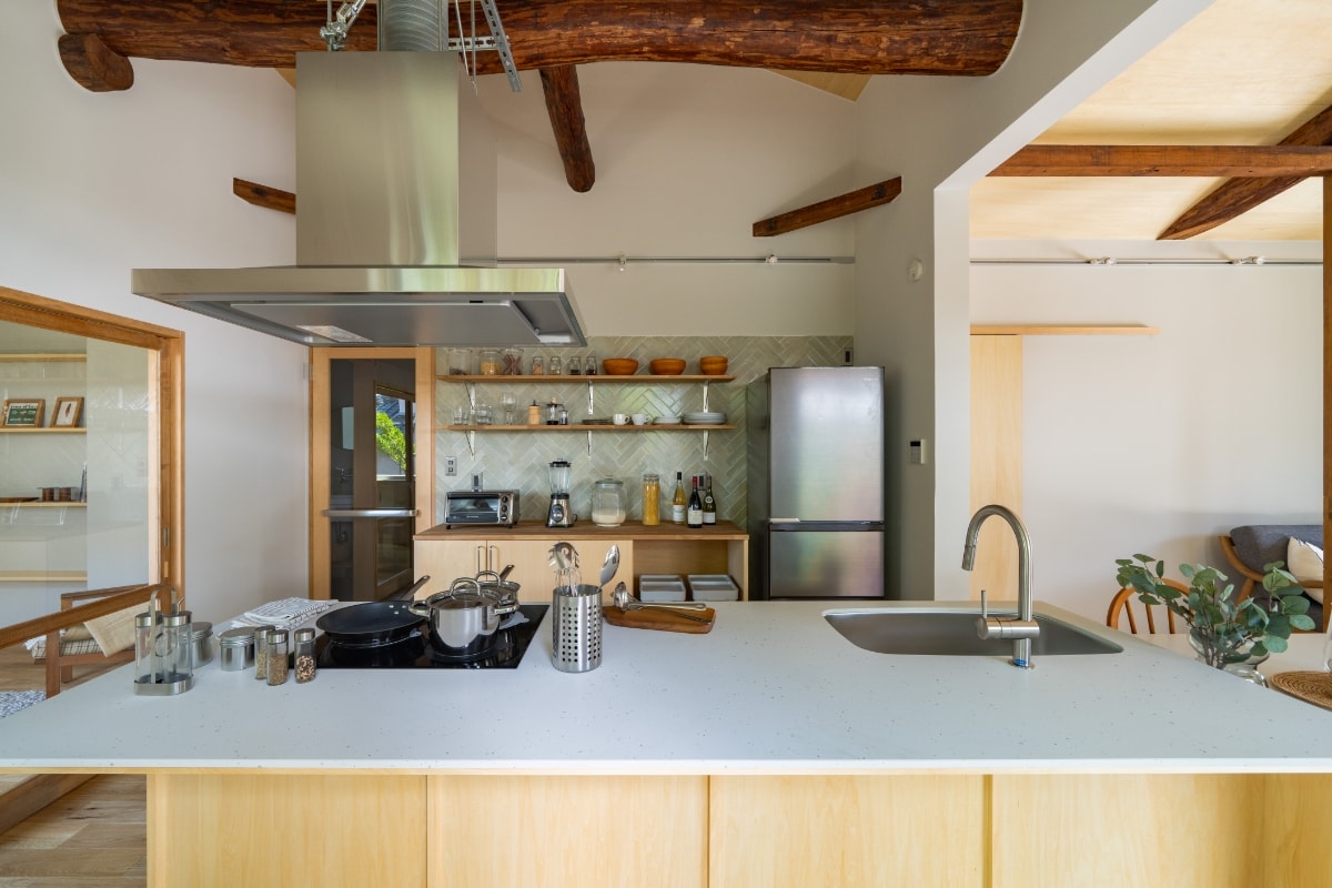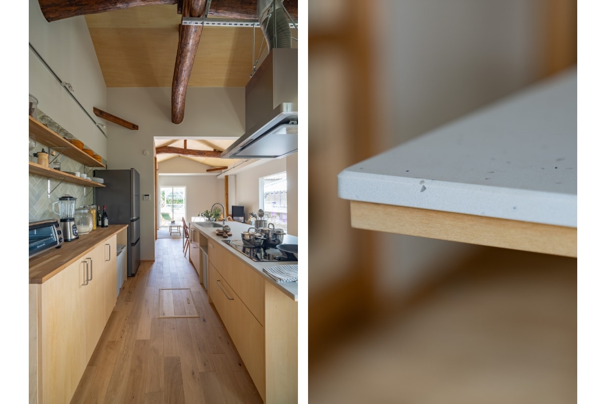 また、この家の主役とも言えるアイランドキッチン・テーブルの天板には揃いのクオーツを採⽤。