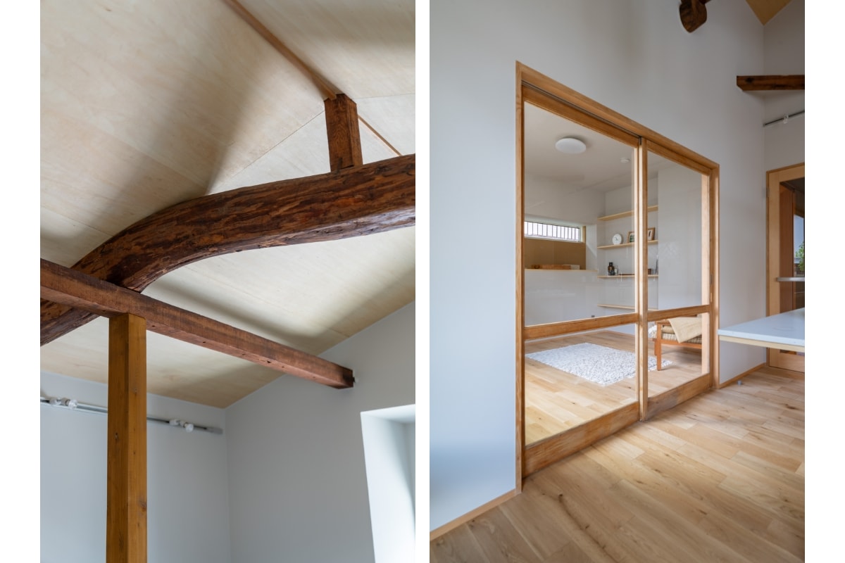 天井の梁や寝室の建具、トイレの⼿洗い洗⾯など既存を活かしたプランニングにすることで、