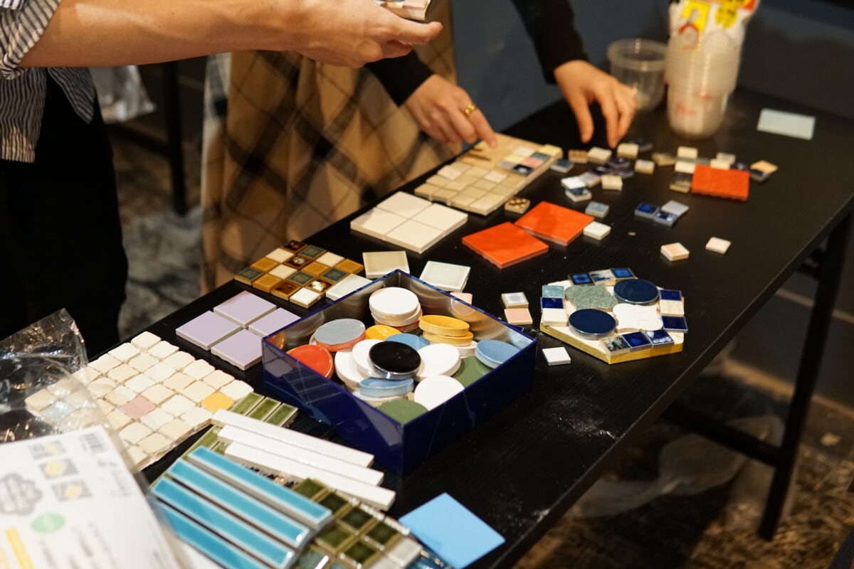 好きなタイルを組み合わせて、建築の施工と同様に目地張りを行うこのワークショップ。