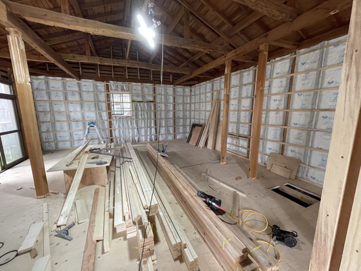 ちなみに、壁にぐるりと白い物が敷き詰められていますが、これが断熱材です。