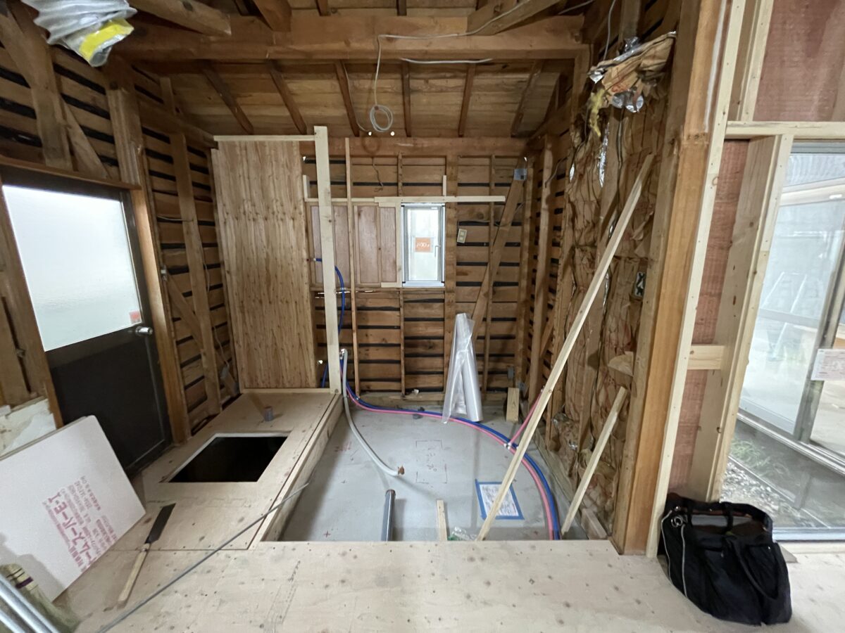 もとキッチンがあった場所は、現在は浴室へと変わりはじめています。