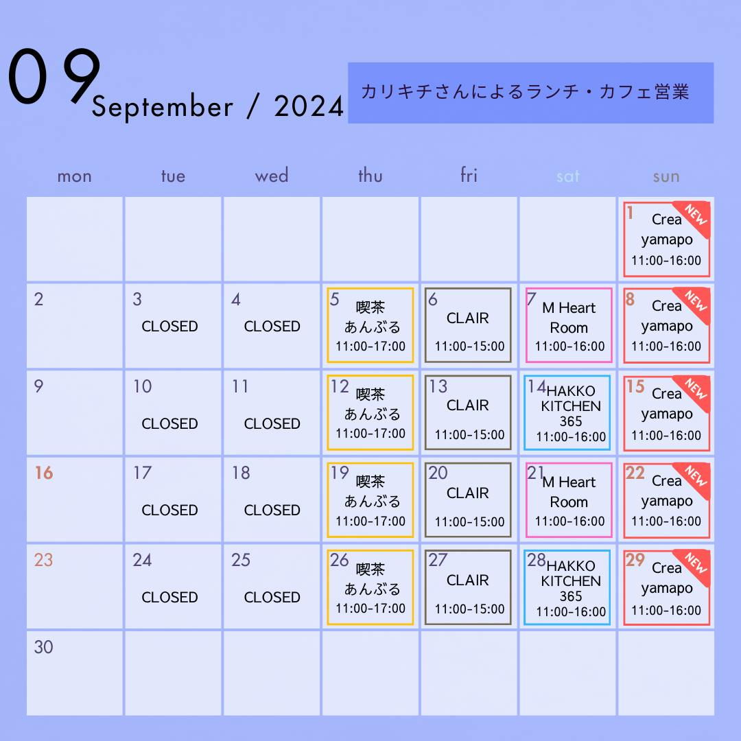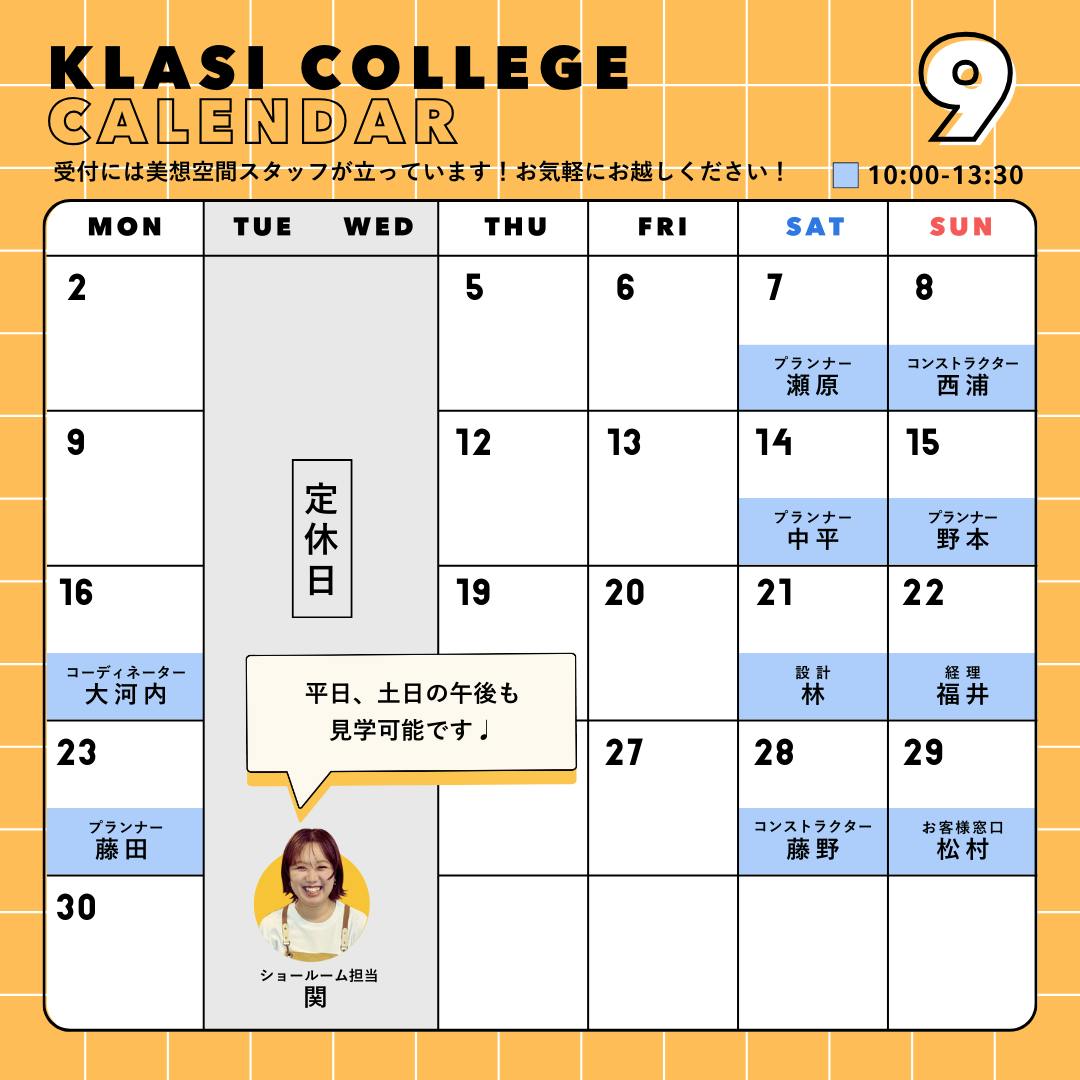 9月の受付カレンダーはコチラです。