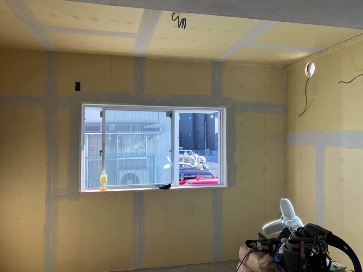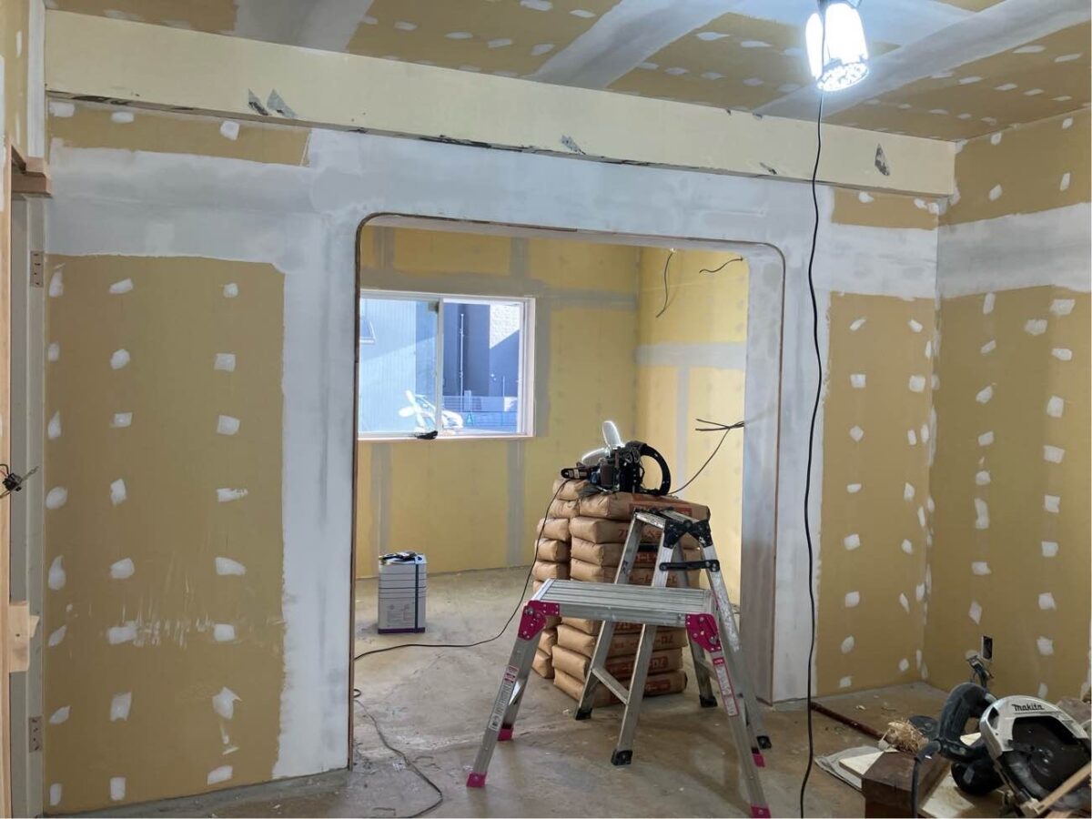 今回壁は、塗装で仕上げる予定なのですが、こちらは石膏ボードに下地処理を行っているところ。