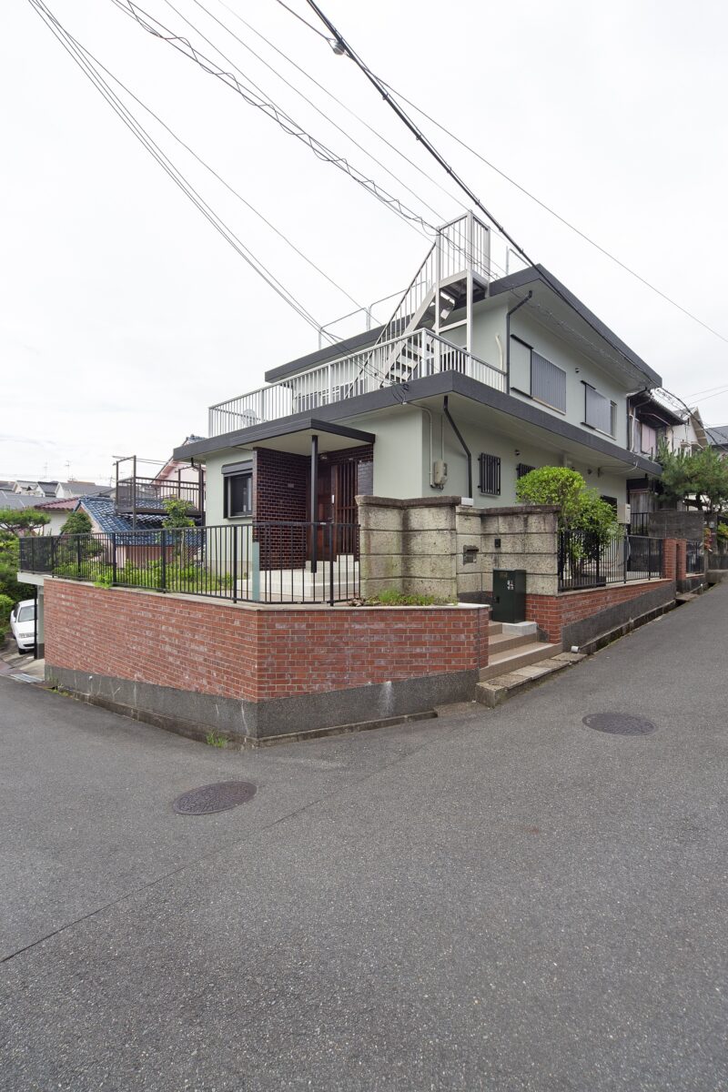 外壁のクリームグリーンとグレーの組合せがまたいいこと。
