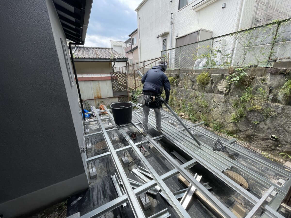 鋼製基礎部材で土台を組んでいきます。土台も木材でつくるパターンもありますが、長く使い続けるための耐久性を考えると、鋼製基礎部材ですね。…ウッドデッキの完成形はお楽しみに♪
