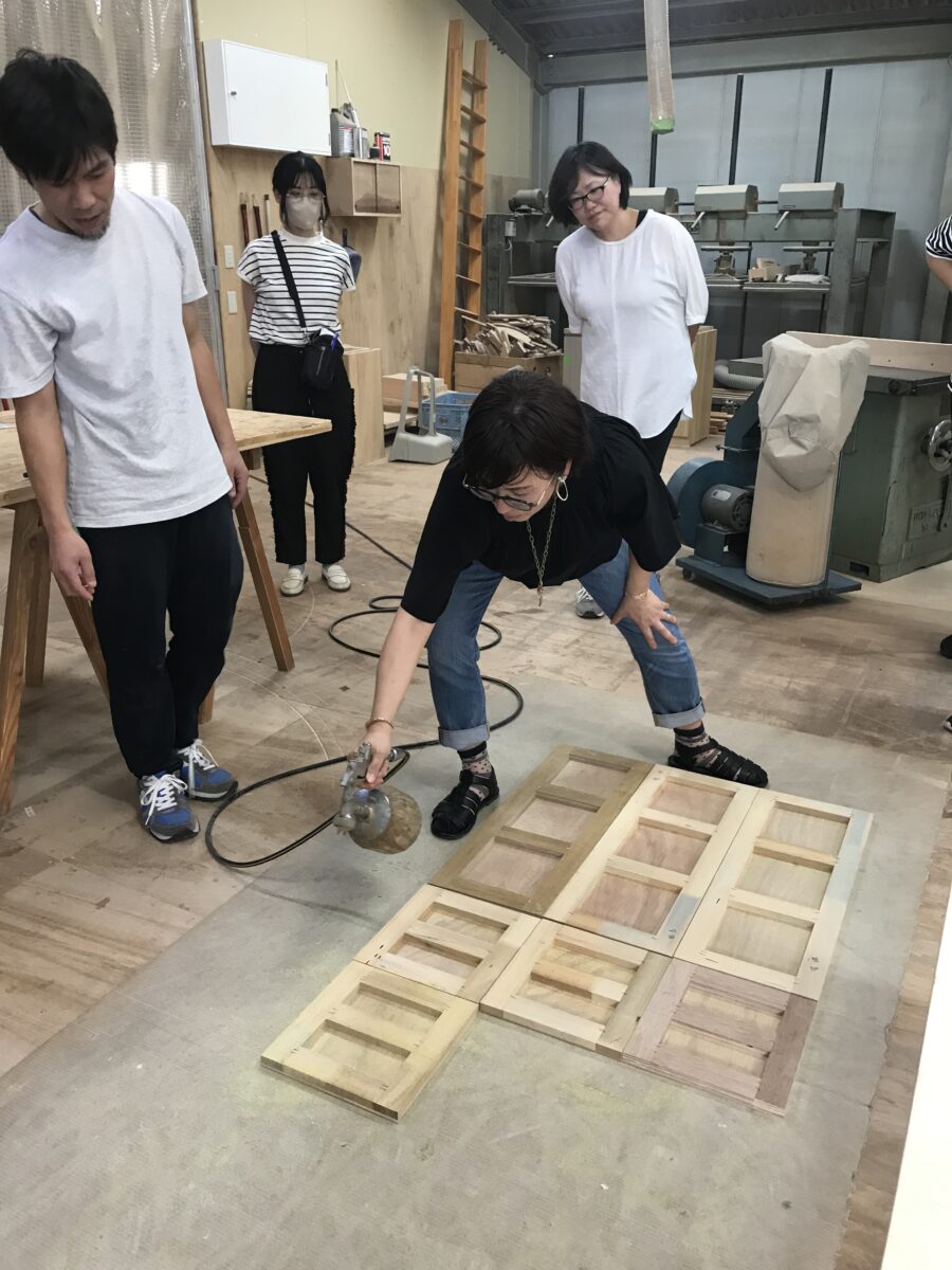 普段は事務所内で、完工した案件の事例共有やメーカーさんを講師にお招きし、最新建材の勉強会を行っているのですが、今回は造作家具をお願いしている会社さんの工場を見学させていただくことに。